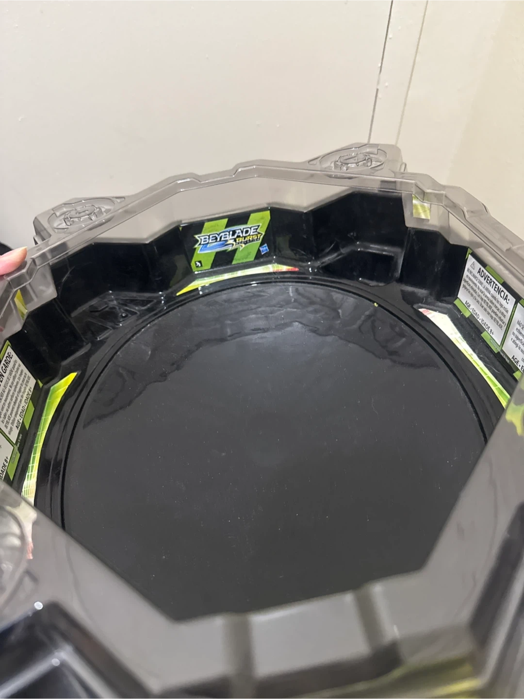 This is a Beyblade Burst arena for exciting battles. It's made of durable plastic and features a black playing surface. Great for aspiring Beyblade champions!