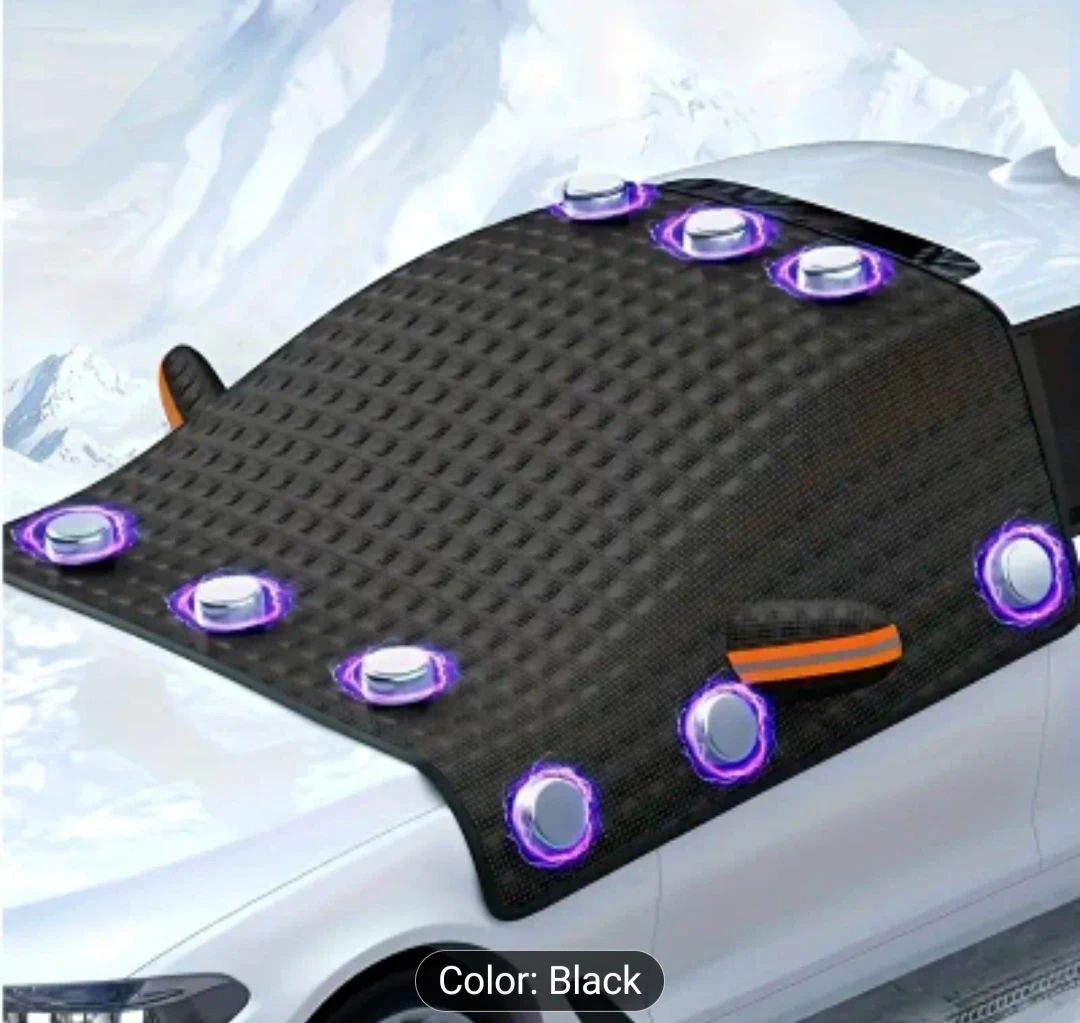 This black windshield magnetic cover protects your car from snow and ice. It's designed to fit most car/suv windshields and features magnetic edges for a secure hold. Includes reflective strips for added visibility.