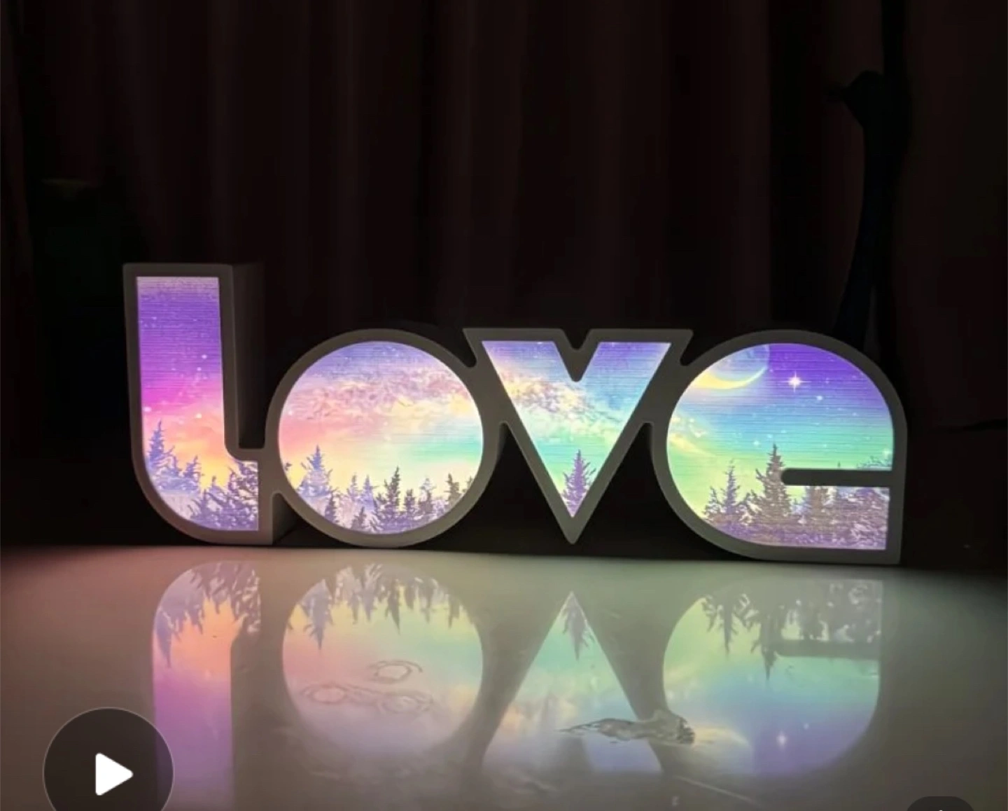 This decorative sign spells out LOVE with a beautiful starry night sky and forest scene. It lights up to create a lovely ambiance. It's perfect for adding a touch of magic to any room!