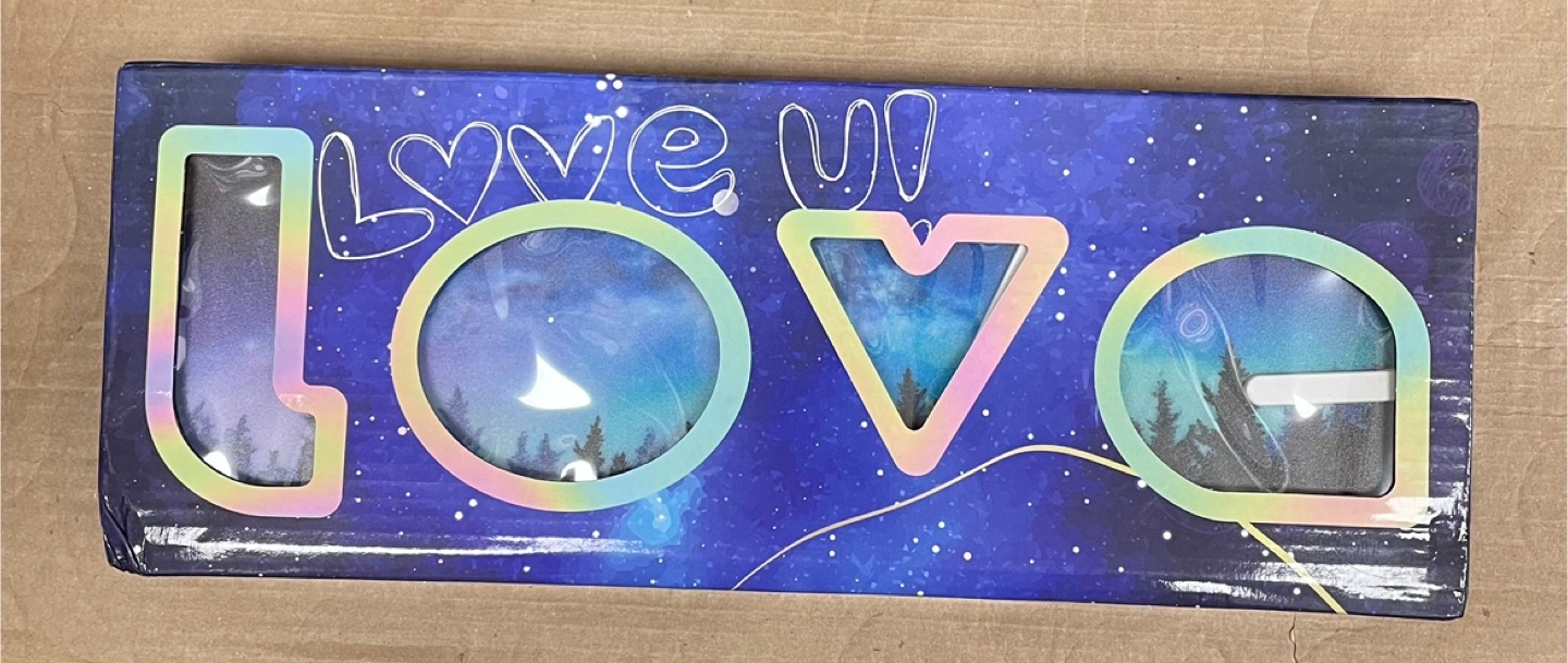 This decorative sign spells out LOVE with a beautiful starry night sky and forest scene. It lights up to create a lovely ambiance. It's perfect for adding a touch of magic to any room!