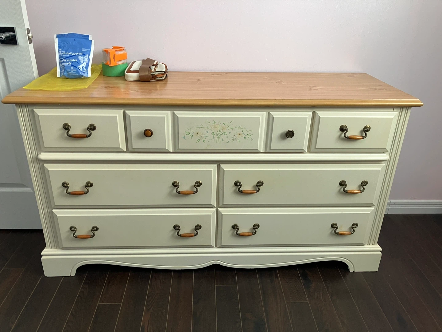 cream-coloured dresser featuring a warm wood top and antique brass hardware. It has six drawers for ample storage.