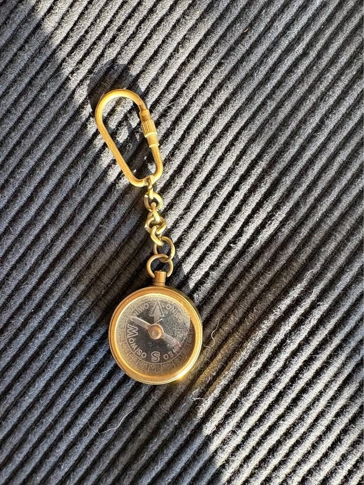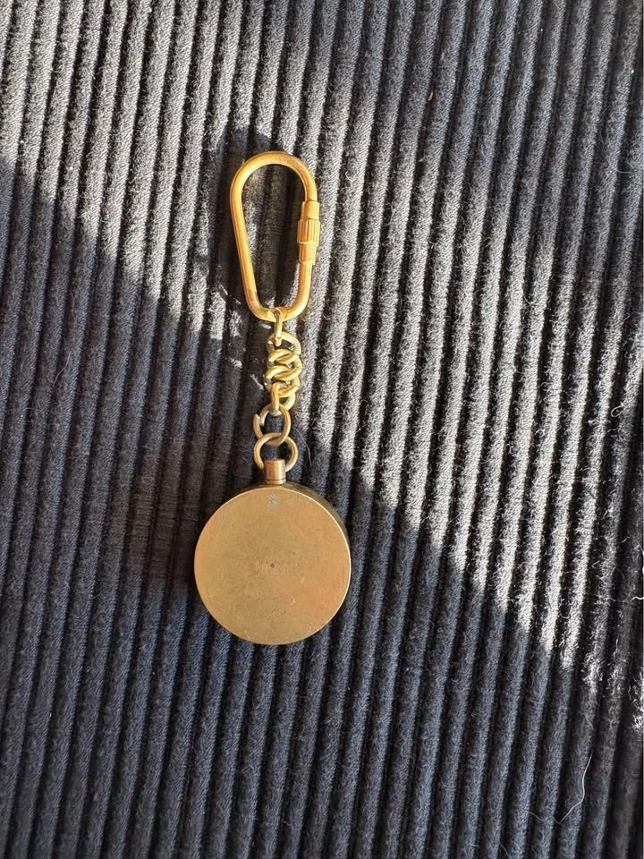 Small brass compass on a keychain clip. Turns freely. Shows wear consistent with age. Good as a keychain, bag charm, or small decor piece. Pickup in Haysboro SW.