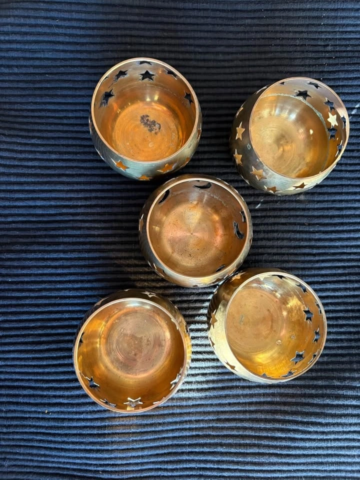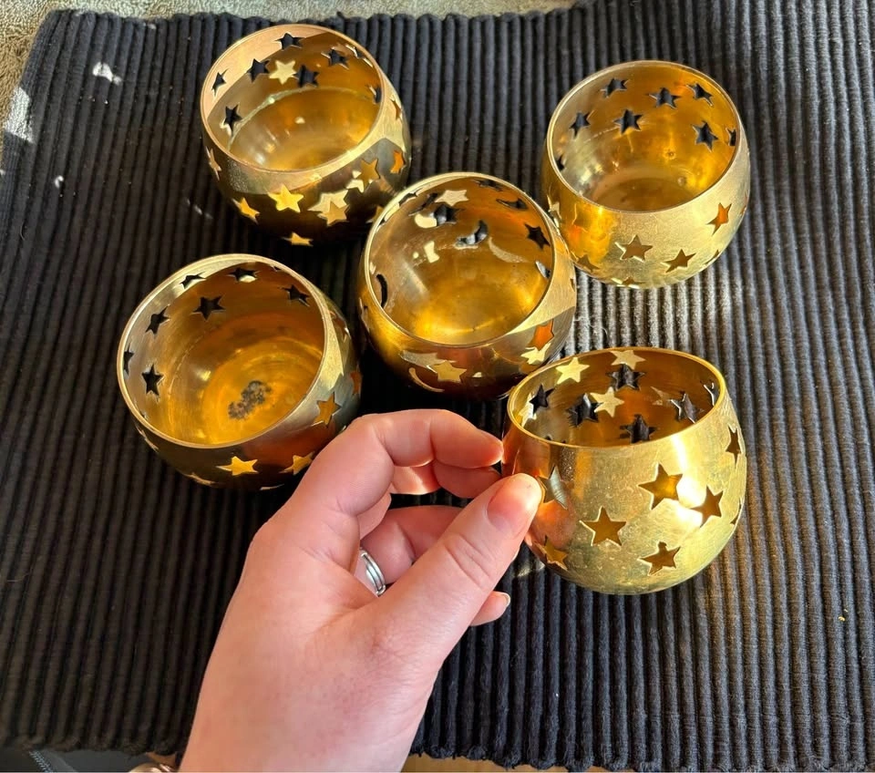 Set of five vintage brass votive or tealight holders with star cutouts. All in good vintage condition with patina. Perfect for tealights, mood lighting, or decor. Selling as a set. Pickup in Haysboro SW.