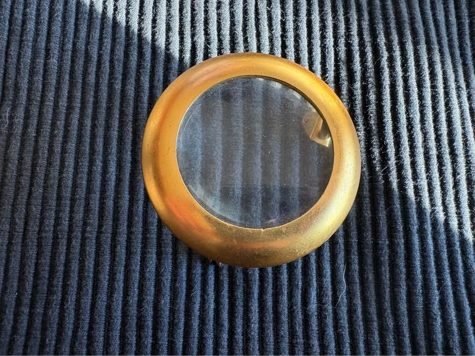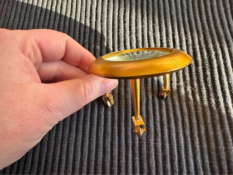 Vintage brass magnifying glass on three small feet. Glass is intact. Shows normal wear and patina from age. Decorative and functional. Looks great on a desk, shelf, or curiosity display. Pickup in Haysboro SW.