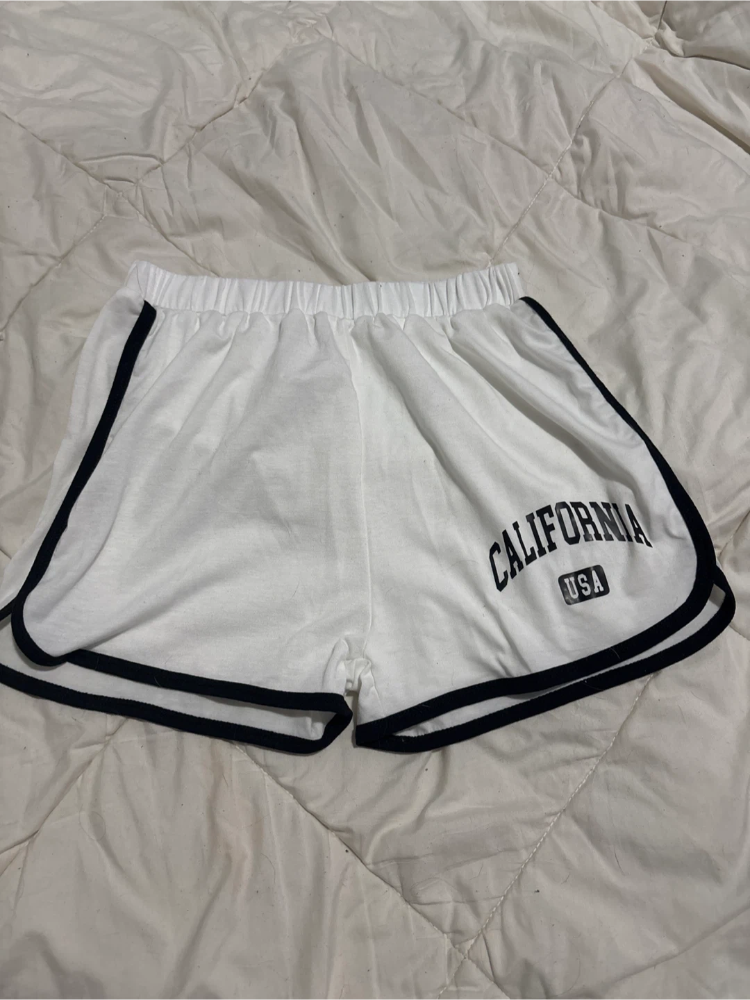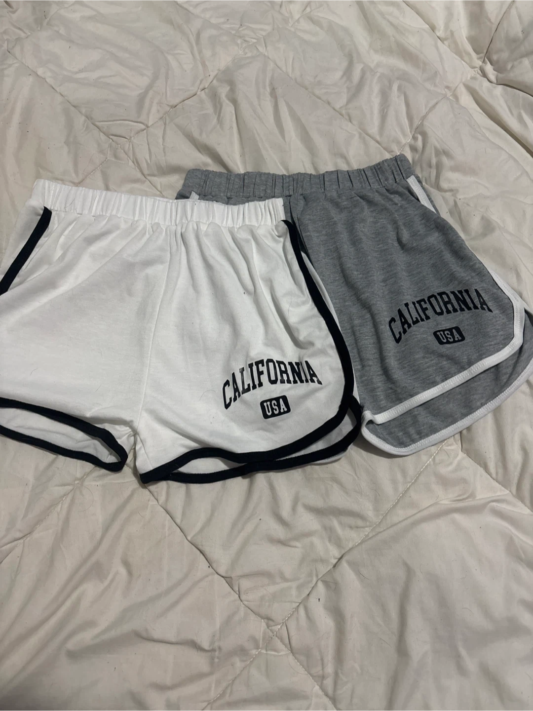 Pair of athletic shorts with 'California USA' graphic. One grey pair with white trim and one white pair with black trim. Elastic waistband.