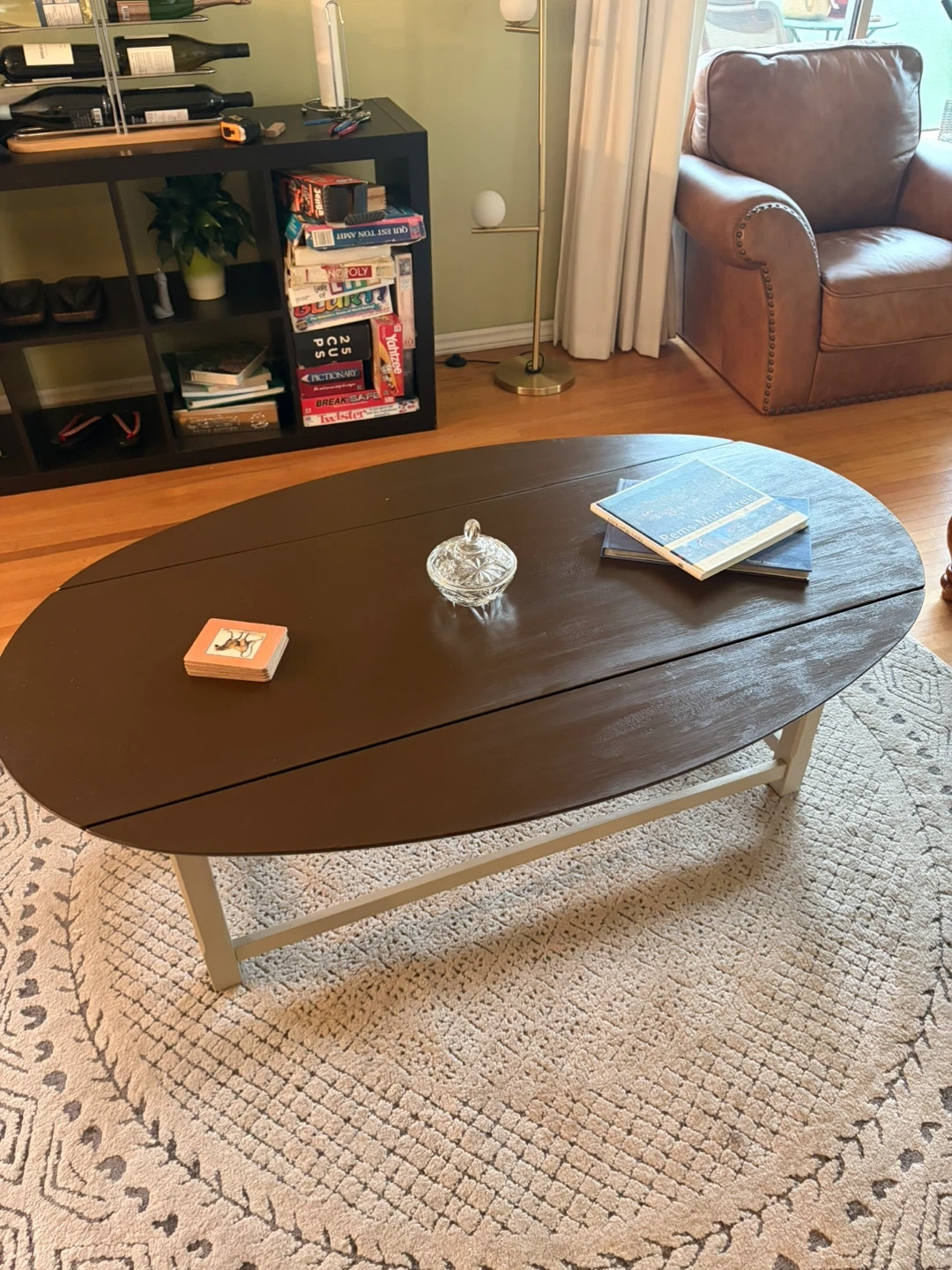 This oval coffee table has a dark brown tabletop with drop leaves. It features a painted light grey base. The table is great for smaller spaces or for when you need extra surface area.
