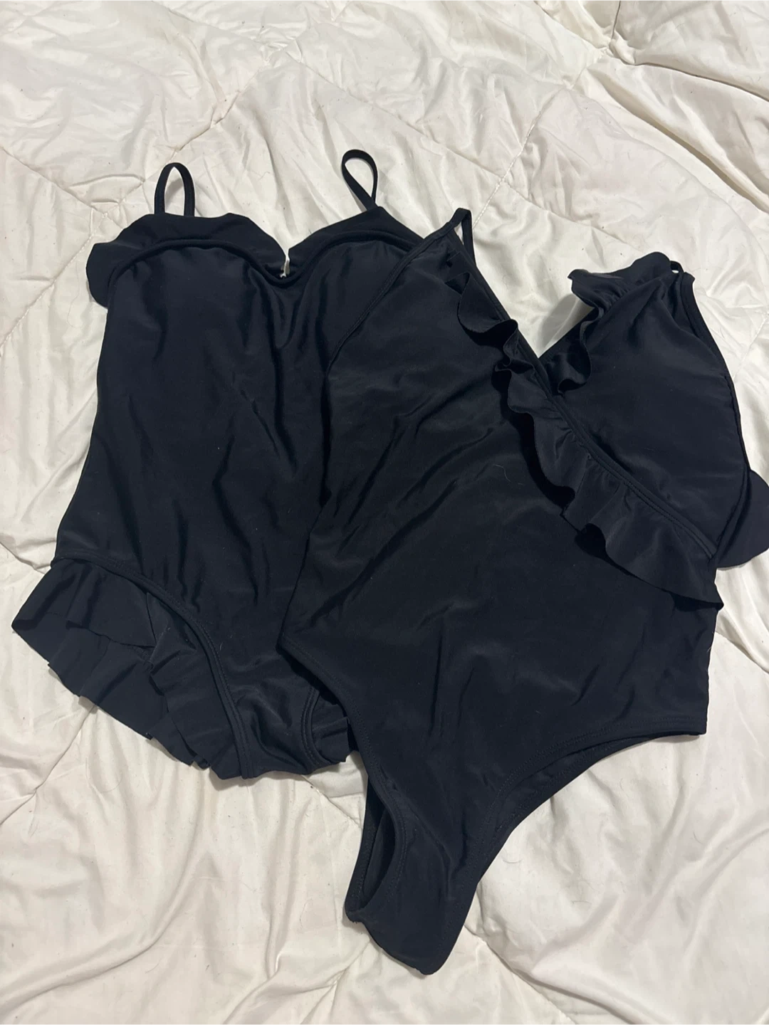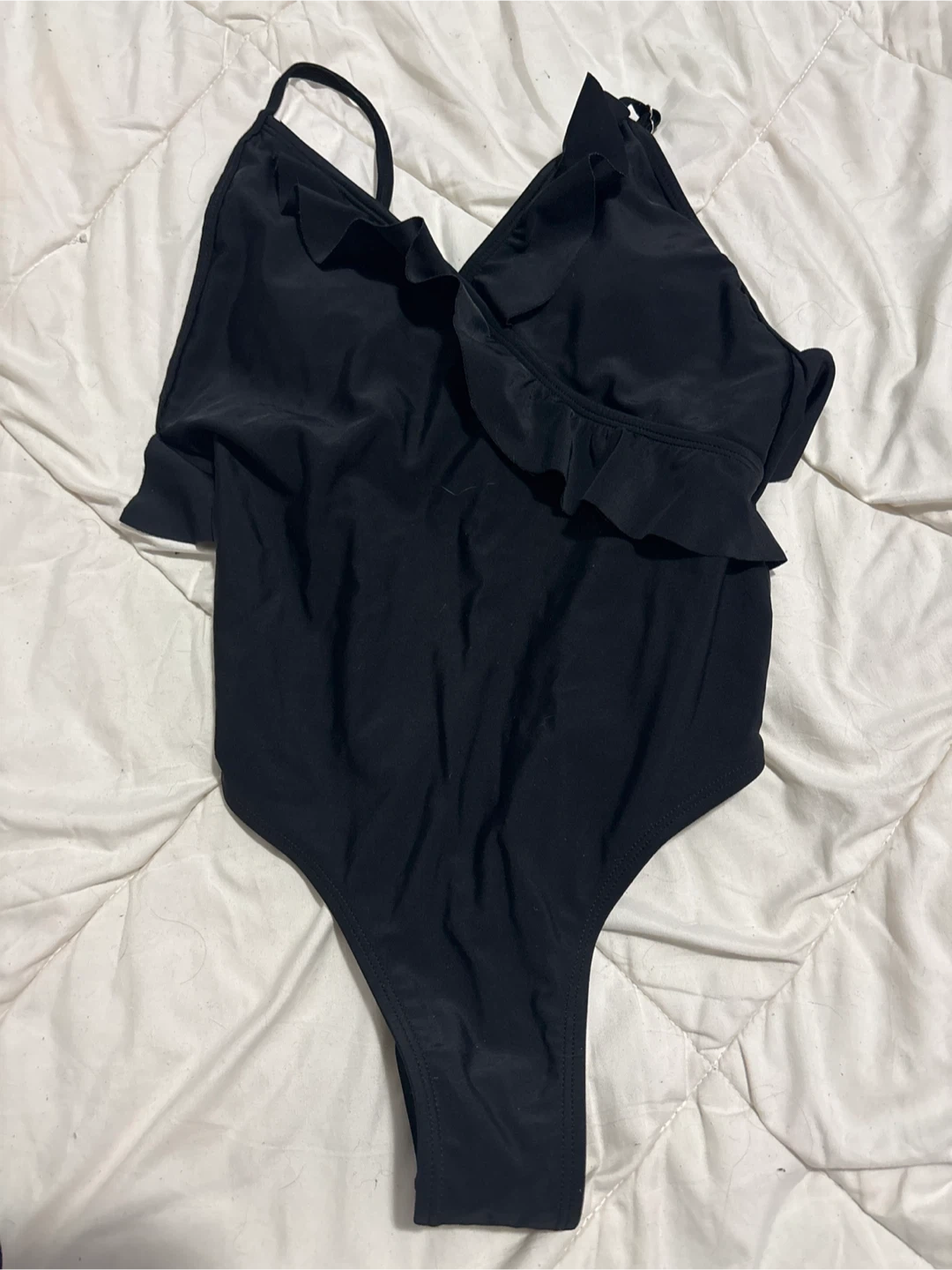A classic black one-piece swimsuits with a ruffled hem. It features adjustable straps for a comfortable fit.