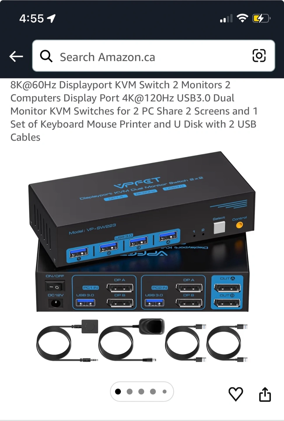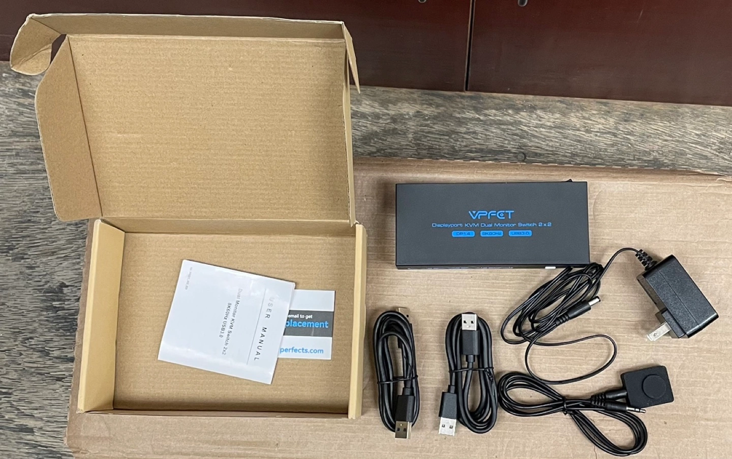 This KVM switch allows you to control two computers with two monitors. It supports Displayport and USB 3.0 connections. All necessary cables and the power adapter are included.