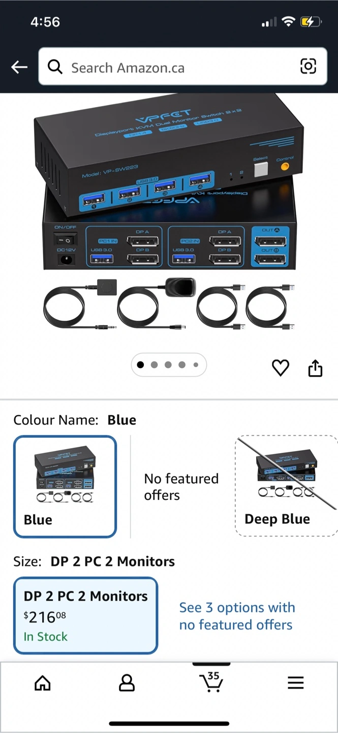 This KVM switch allows you to control two computers with two monitors. It supports Displayport and USB 3.0 connections. All necessary cables and the power adapter are included.