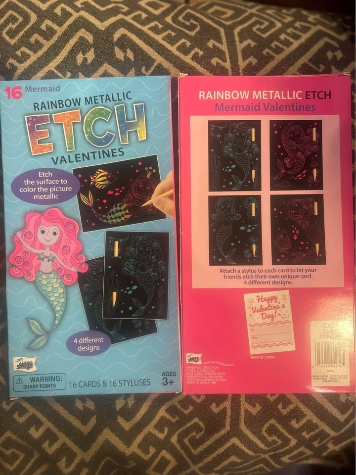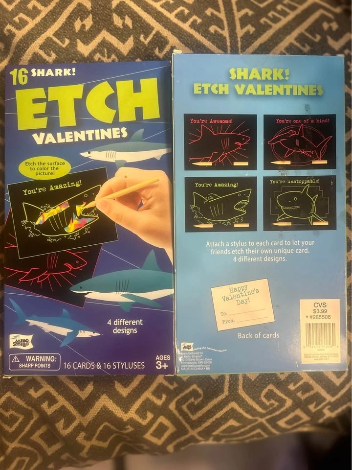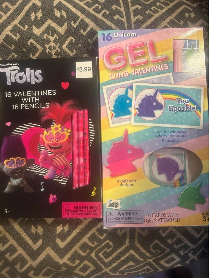 Valentine packs perfect for friends, classmates, family, or daycare. Available for $2.50 each or 2 for $4.50. I have 4 rocket ship packs, 1 Trolls pack, and 1 Unicorn Gel Clings pack. All other designs have 2 packs available. Please let me know if you'd like more pictures. Pick up in Port Moody or UBC.