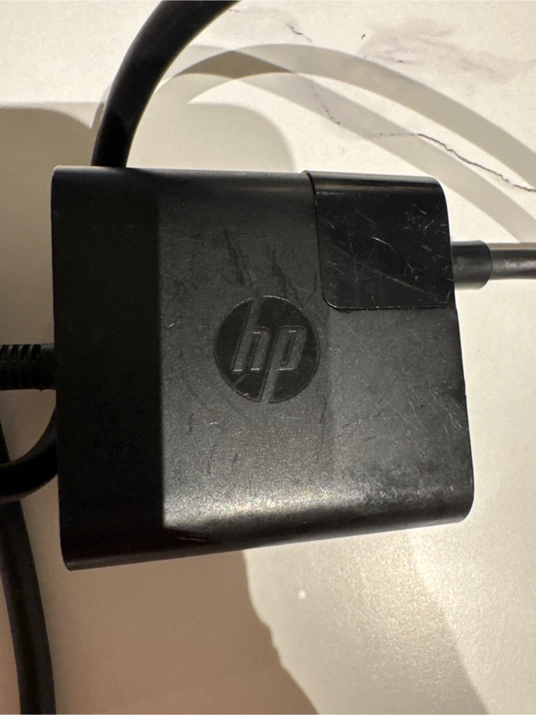 This is an HP AC adapter for laptops. It features a USB-C connector and outputs 100-240V AC. The adapter is black and comes with its power cord.