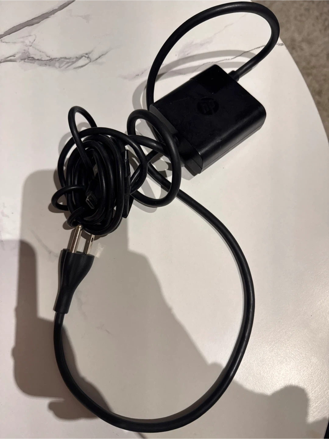 This is an HP AC adapter for laptops. It features a USB-C connector and outputs 100-240V AC. The adapter is black and comes with its power cord.