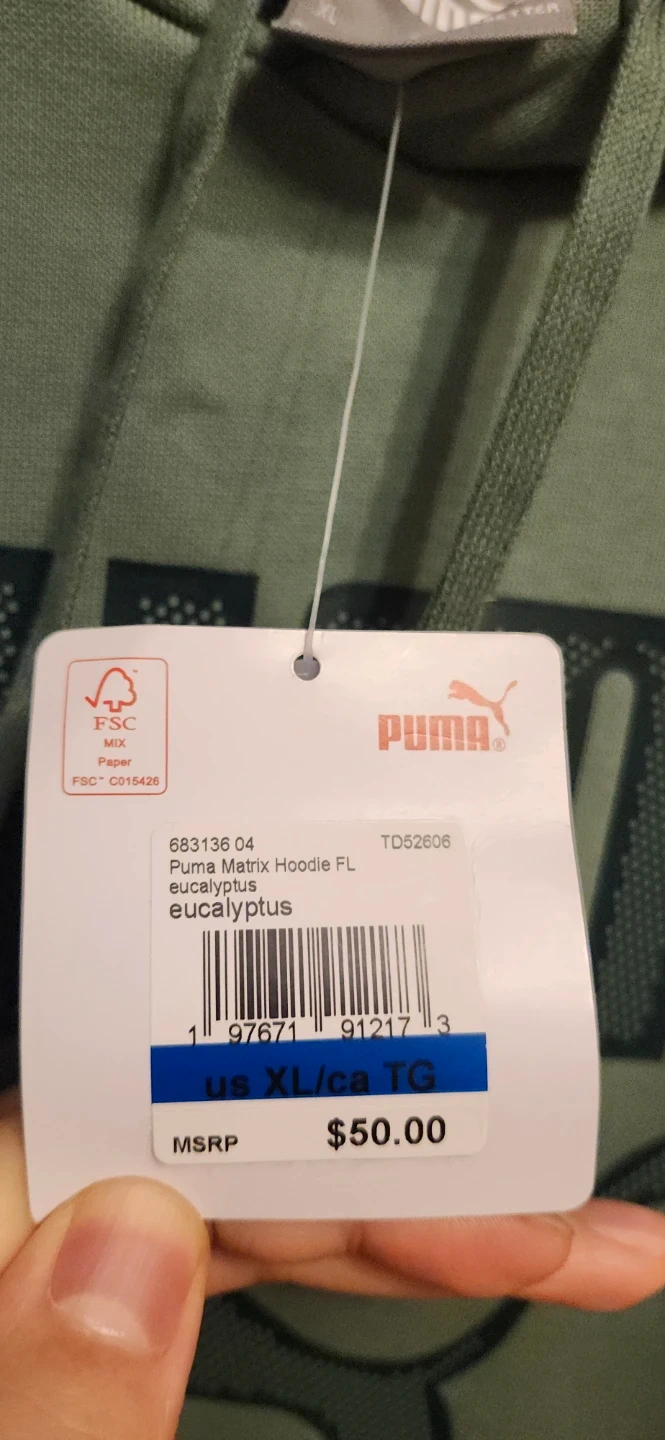 This is a Puma Matrix Hoodie FL in eucalyptus colour. It's a size XL. This hoodie has a front kangaroo pocket and an adjustable drawstring hood.