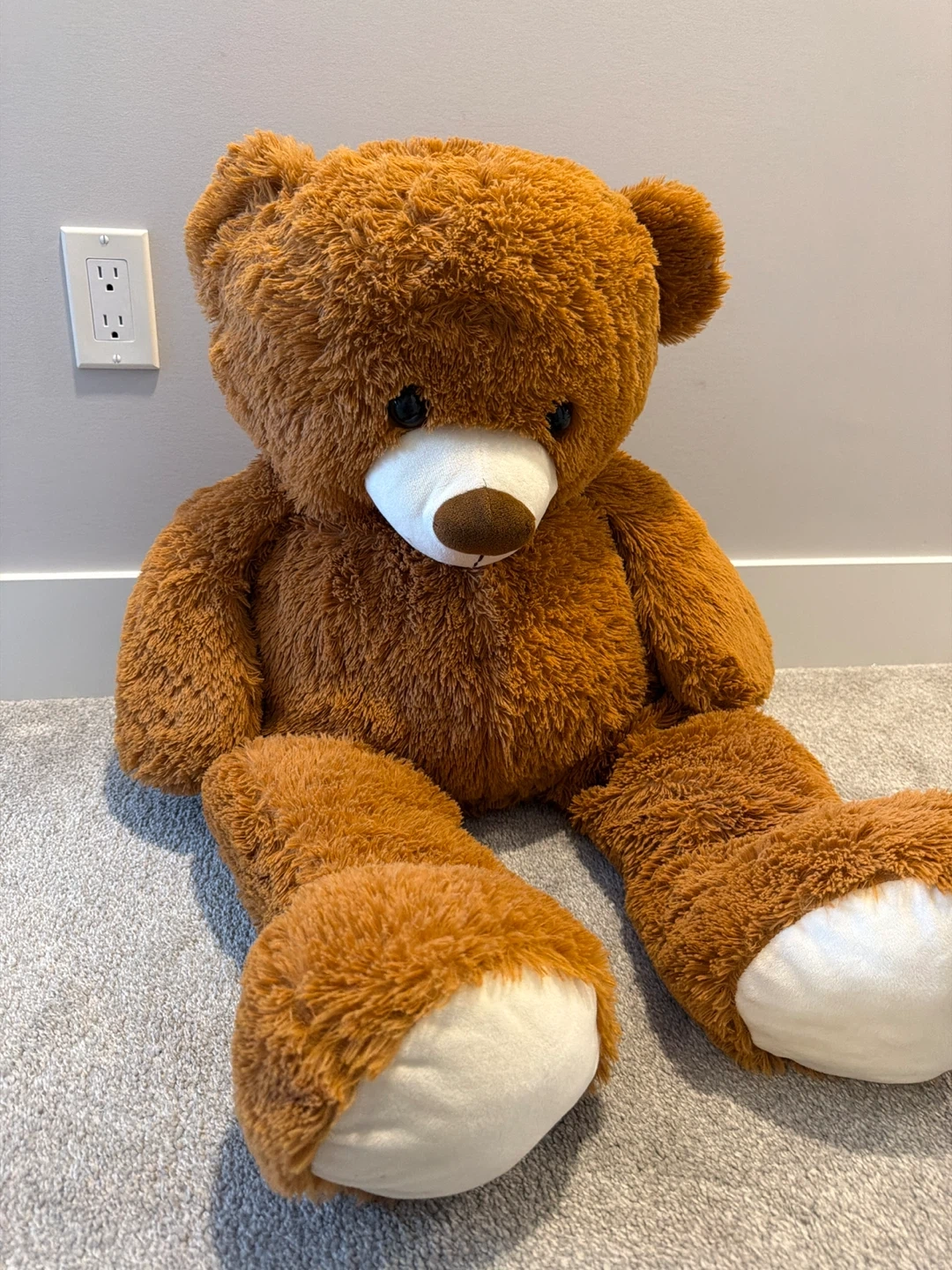A large, soft brown teddy bear plush. It's made with a fuzzy exterior. Its paws have white accents.