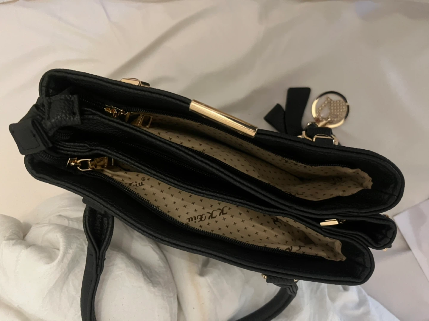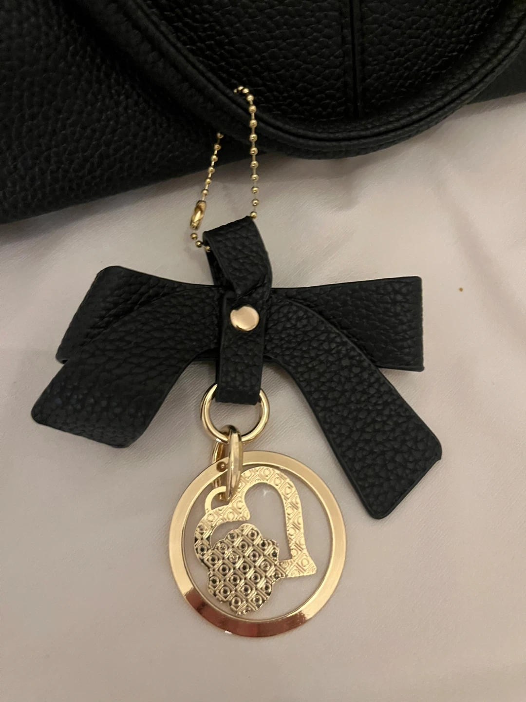 it features a decorative bow charm with a gold-toned heart pendant and a secure zip closure. Plenty of room inside for your essentials! it has three compartments and has never been used! only opened to take pictures! i will give with the original packaging
