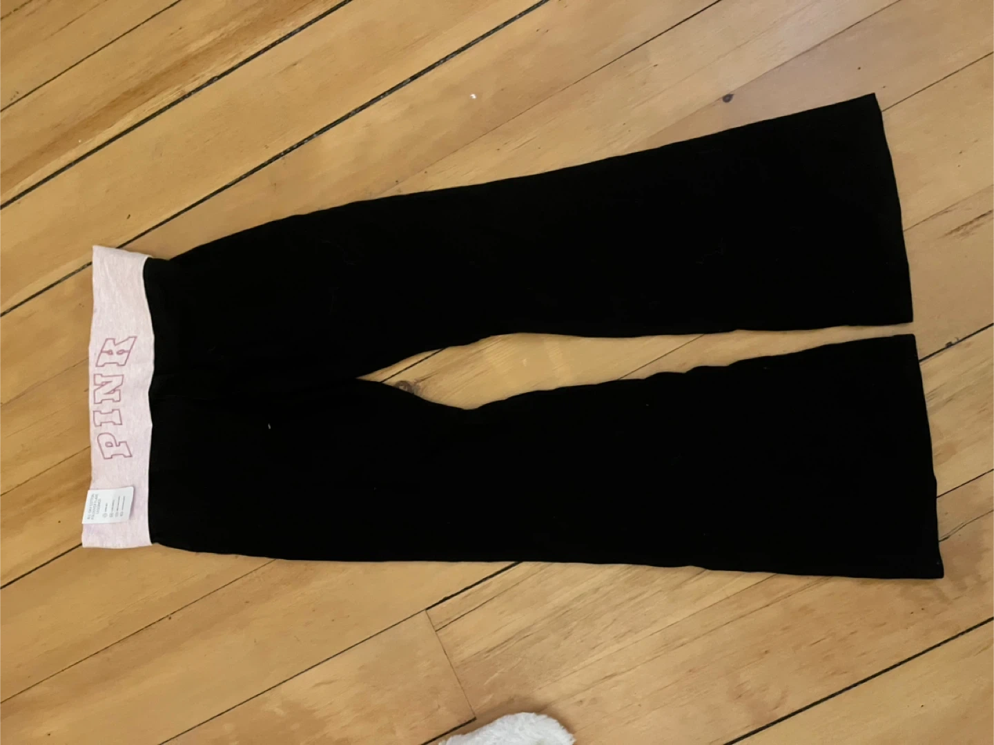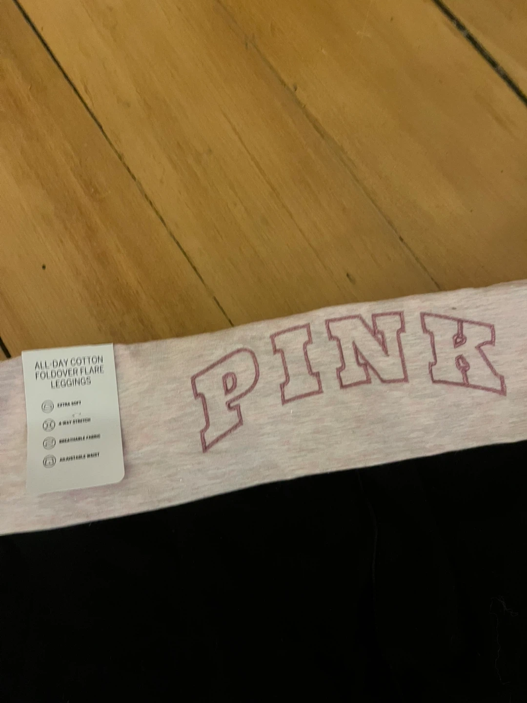 These PINK by Victoria's Secret leggings are made of all-day cotton. They feature a foldover waist and a 4-way stretch fabric for comfort. The inseam is 32 inches, and they are a size large. i got these brand new, not my style or my size. it has tags still on. Price is not negotiable.