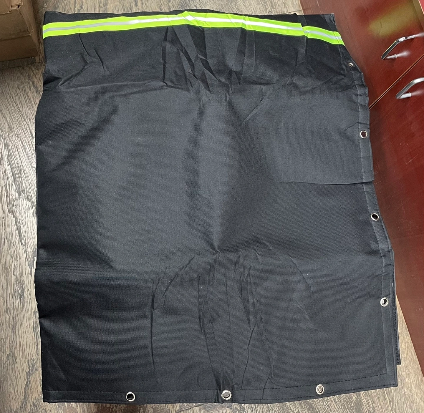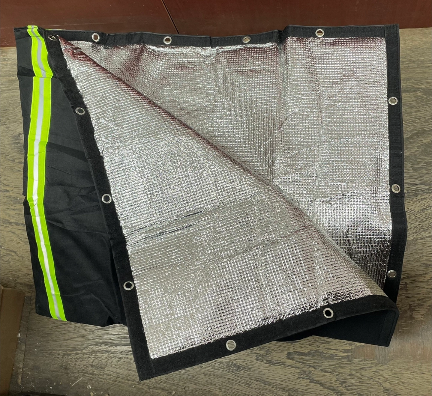 This cover features a black exterior with silver reflective stripes along the top edge. It has a silver insulated thermal lining. Grommets are present around the edges for secure fastening. It's useful for protecting items from temperature changes.
