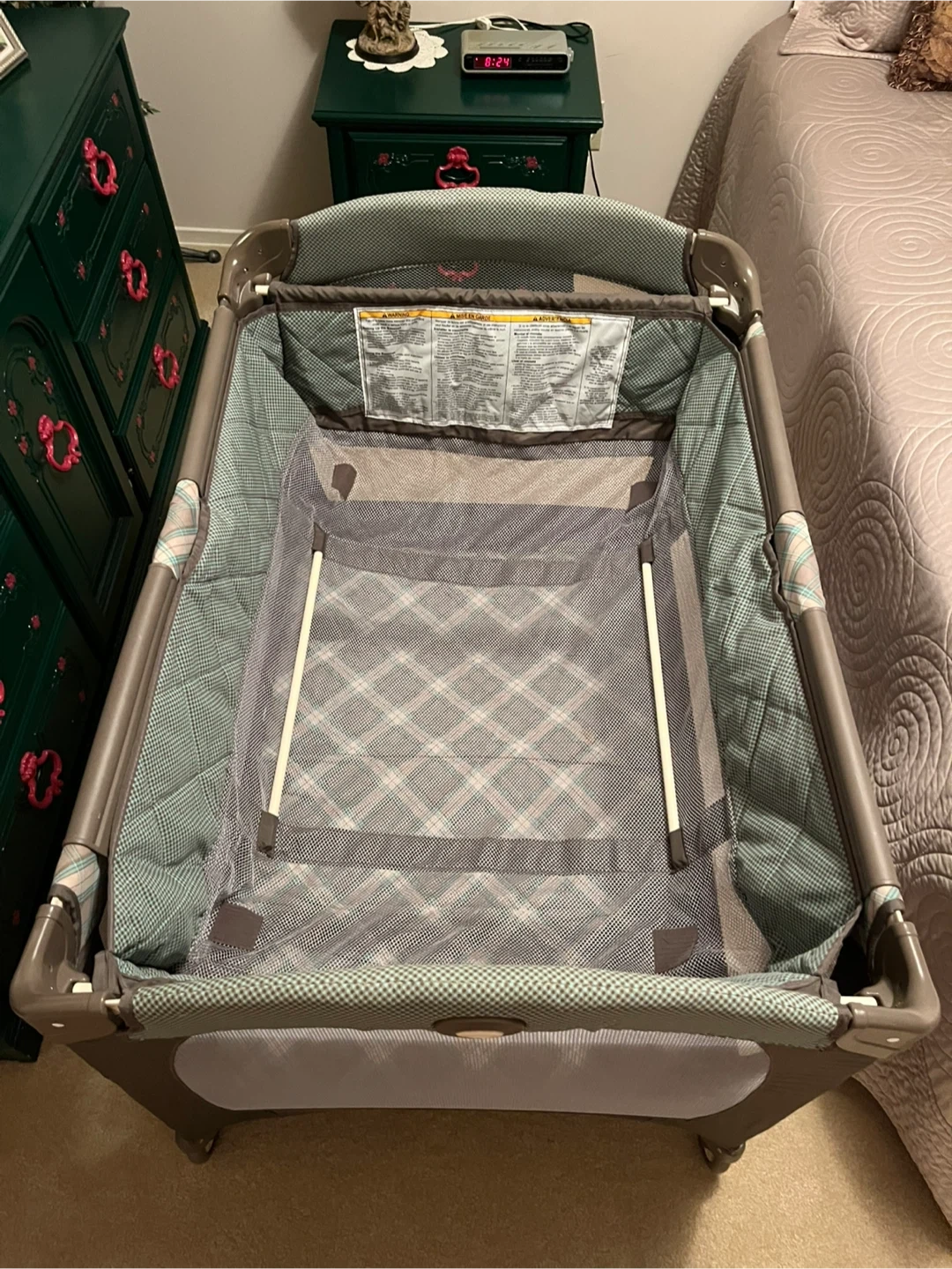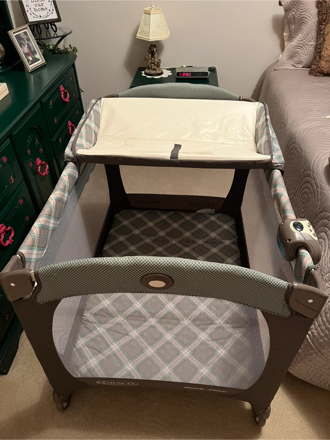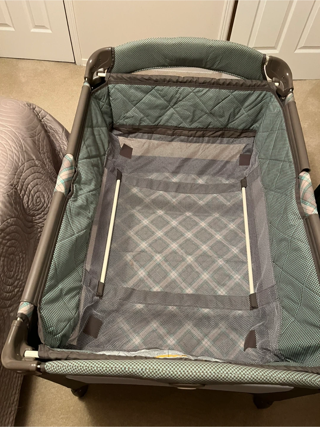This is a Graco pack 'n playard with a bassinet attachment and a changing station. It features mesh sides for ventilation and a foldable design for easy storage. It's suitable for infants and toddlers.