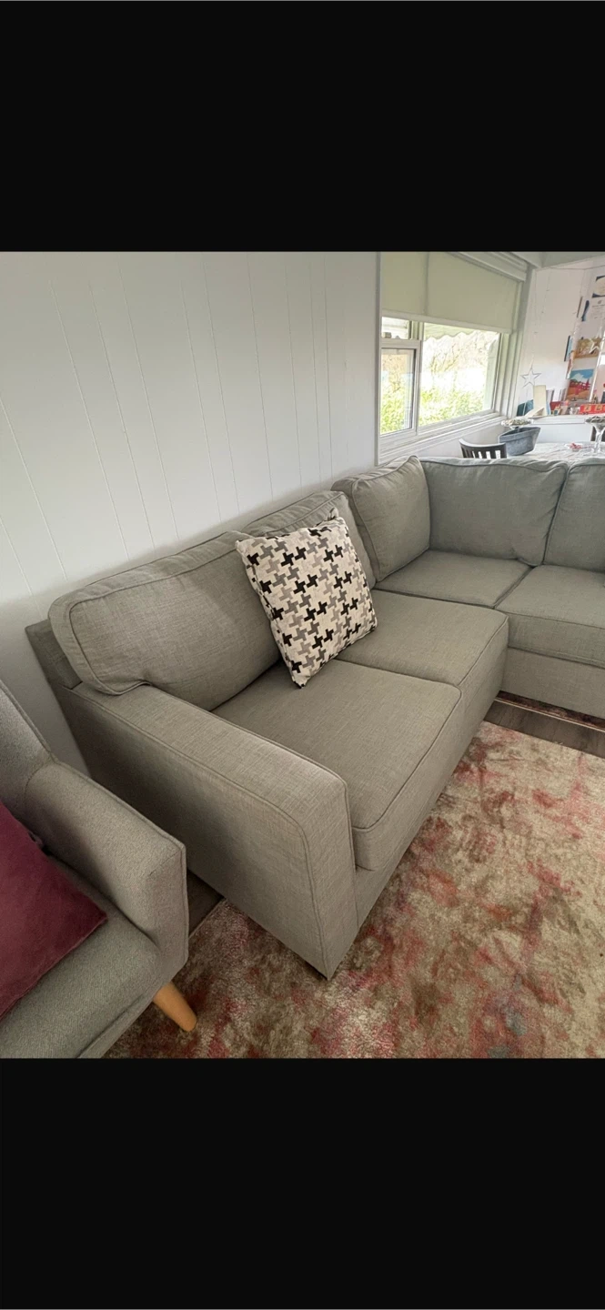 A comfortable grey sectional sofa, perfect for a living room. Upholstered in a durable fabric with clean lines. Includes two decorative throw pillows.