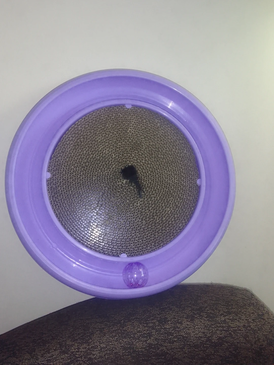 -circular ball track with a cardboard scratcher in the middle,