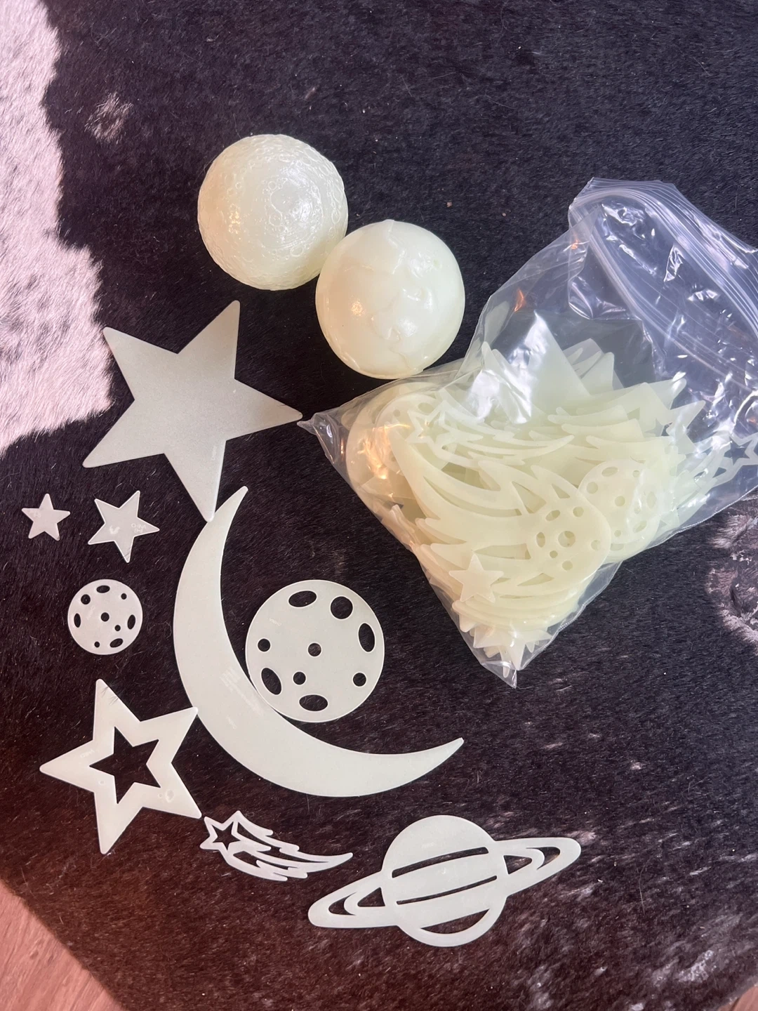 Add some cosmic fun to your walls with these glow-in-the-dark space decals. They include moons, stars, planets, and shooting stars. Perfect for a bedroom or playroom!