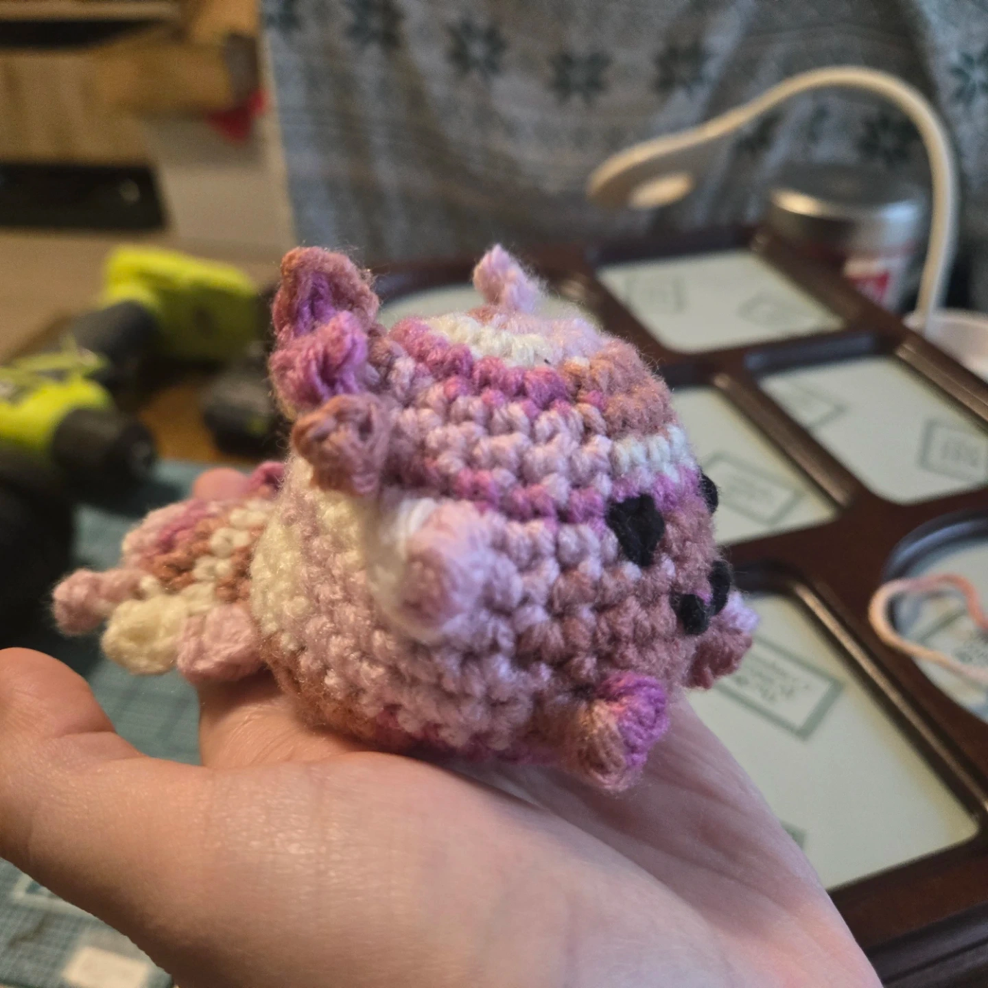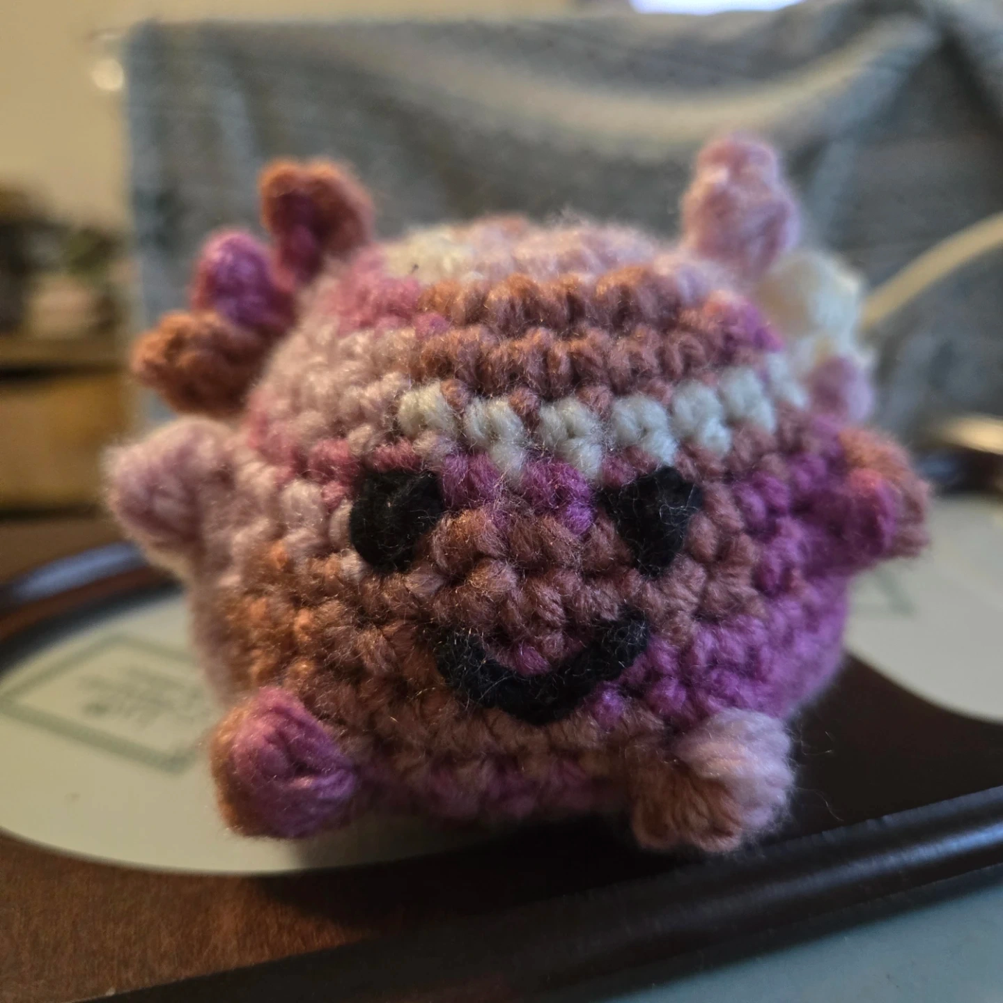 This is a cute, hand-crocheted axolotl plushie. It's made with soft yarn in a pretty pink, purple, and white variegated colourway. It features embroidered eyes and a smiling mouth.