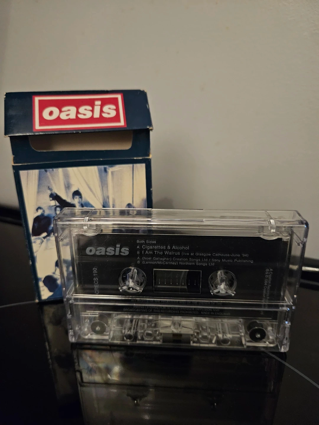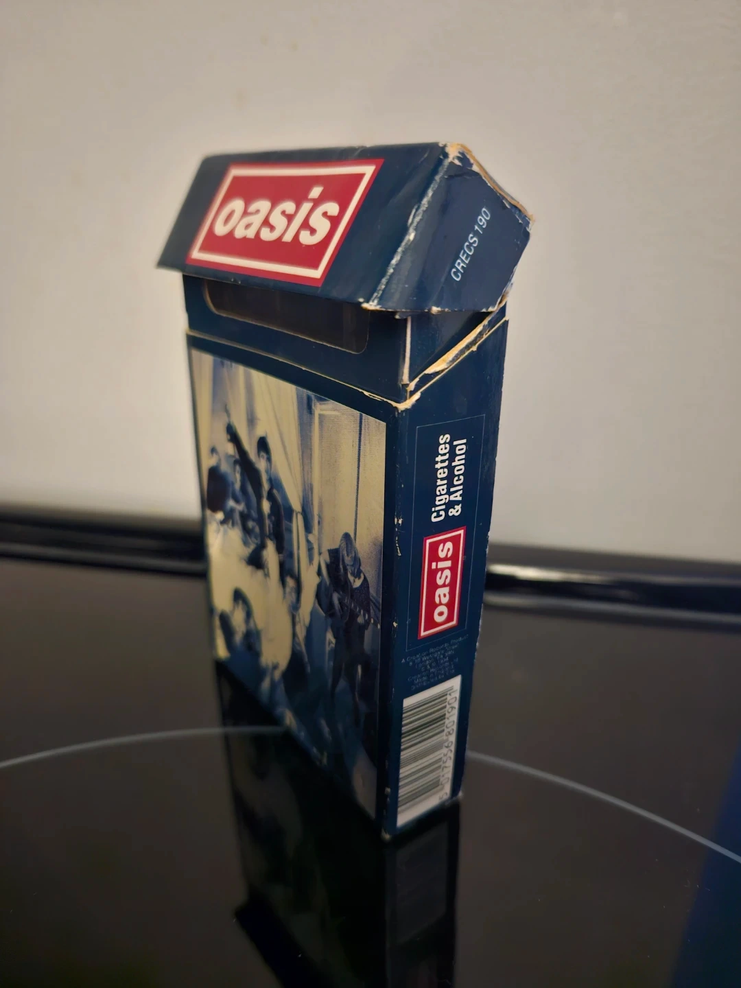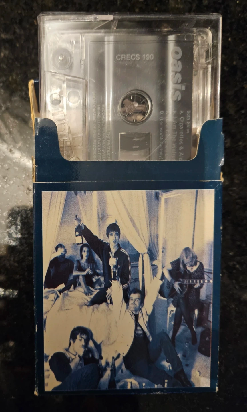 This rare example is an original 1994 Limited Edition UK 1st Issue cassette of this iconic OASIS single. It comes in a collectable flip-top "cigarette pack" cardboard outer case with an inner clear jewel case and clear tape shell. The catalogue number is CRECS 190.