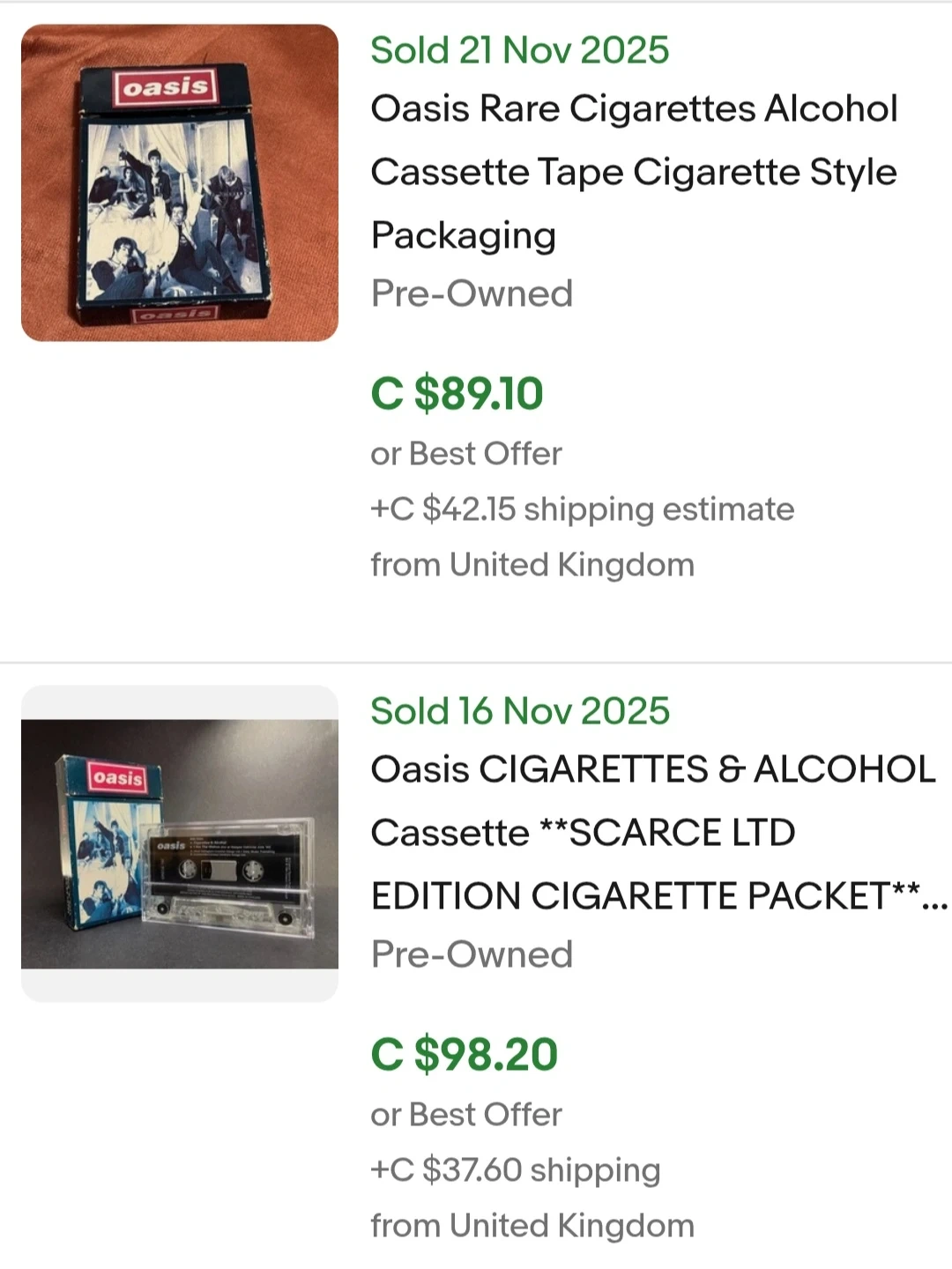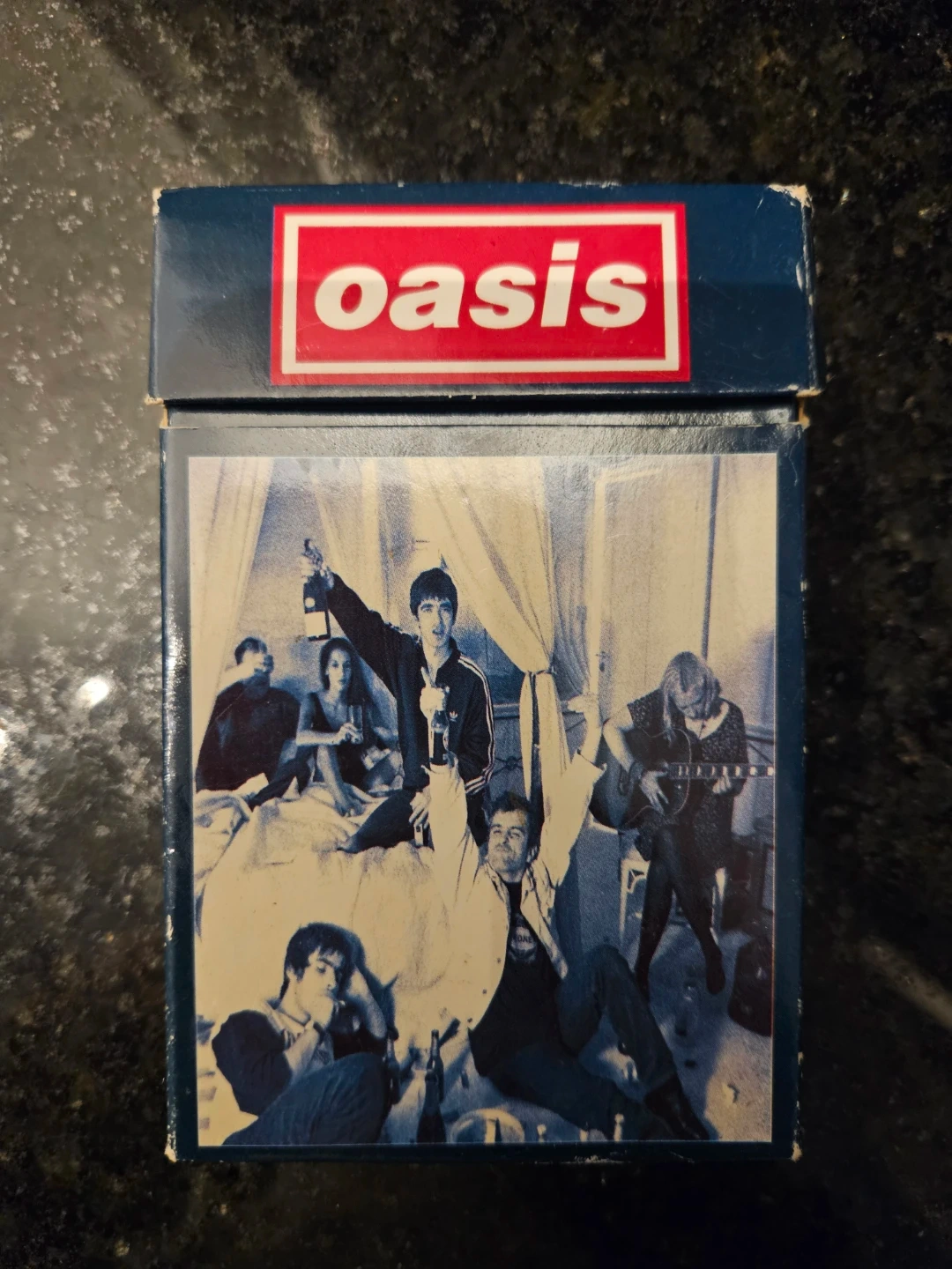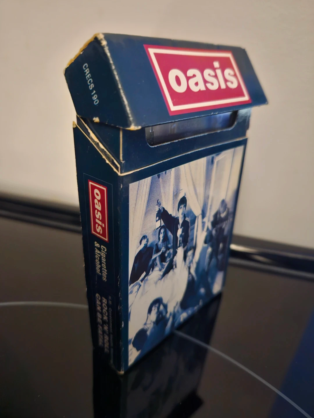 This rare example is an original 1994 Limited Edition UK 1st Issue cassette of this iconic OASIS single. It comes in a collectable flip-top "cigarette pack" cardboard outer case with an inner clear jewel case and clear tape shell. The catalogue number is CRECS 190.