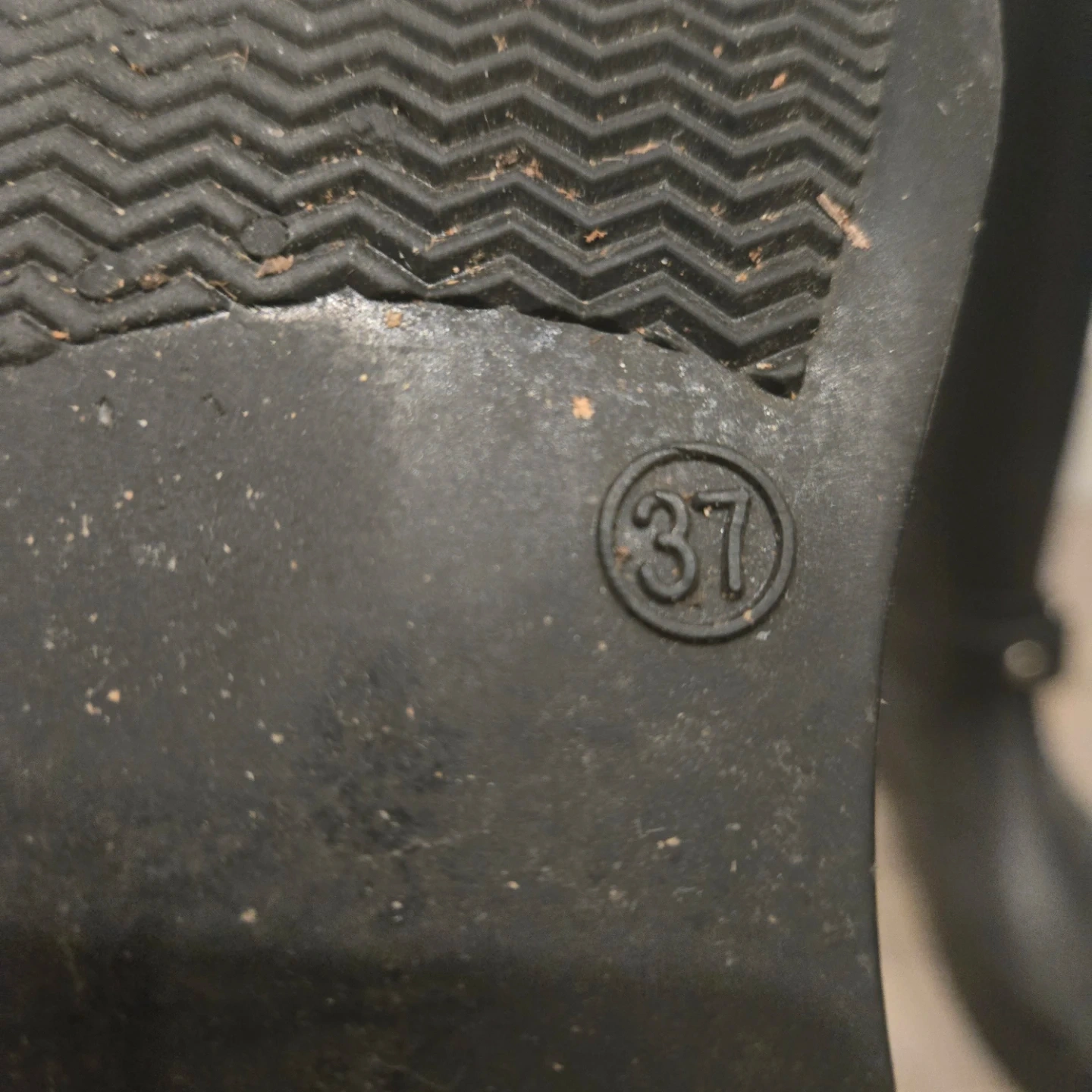 Black rubber rain boots. These boots feature a zipper closure at the back and an adjustable strap. Size 37 is clearly marked on the sole. They're made for keeping your feet dry!