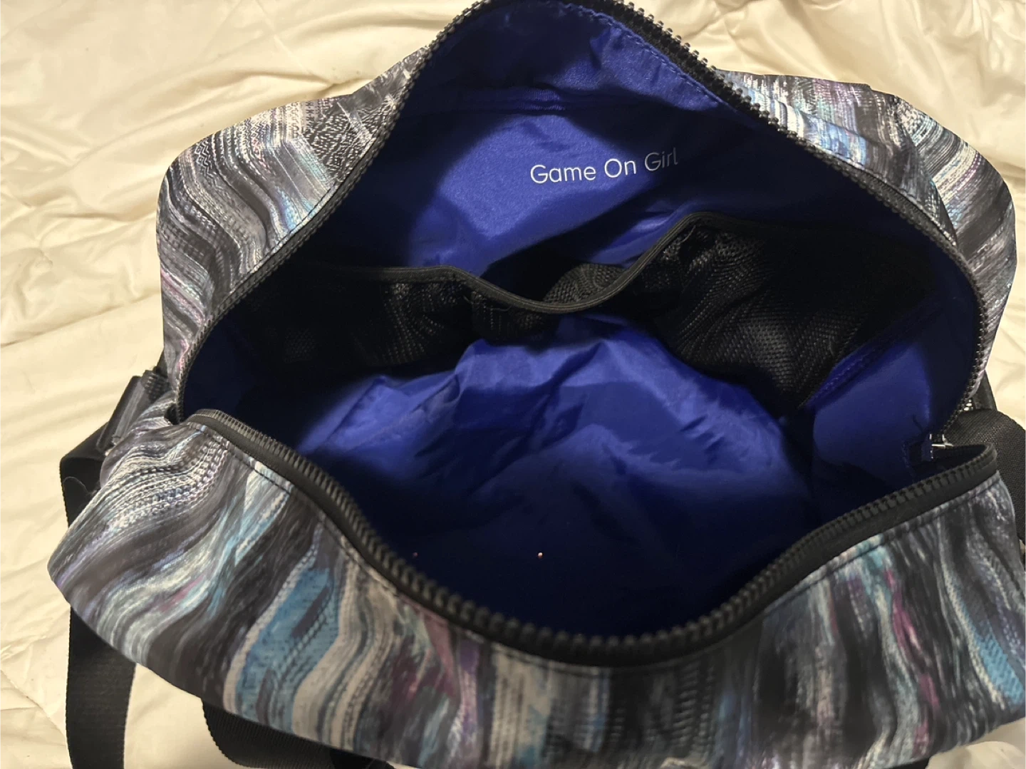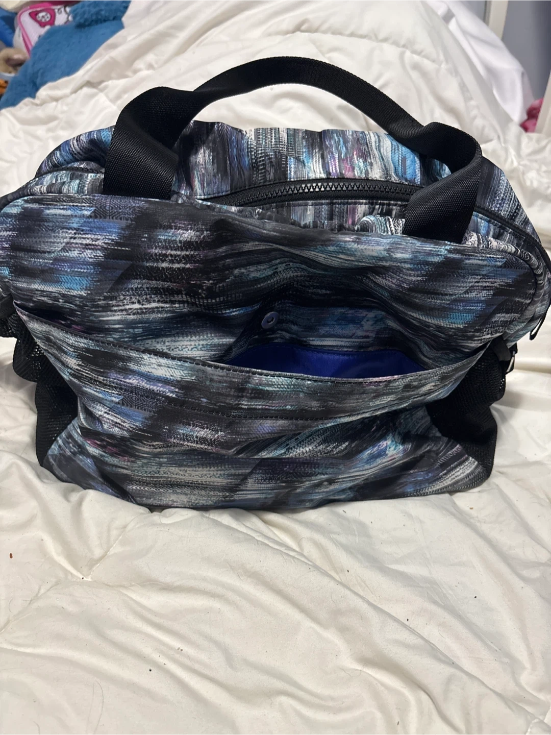 This Lululemon duffle bag has a vibrant, abstract pattern. It features multiple interior pockets and a bottom hidden pocket for shoes or slippers. Made with durable fabric. Perfect for any kid of sports with lots of space.