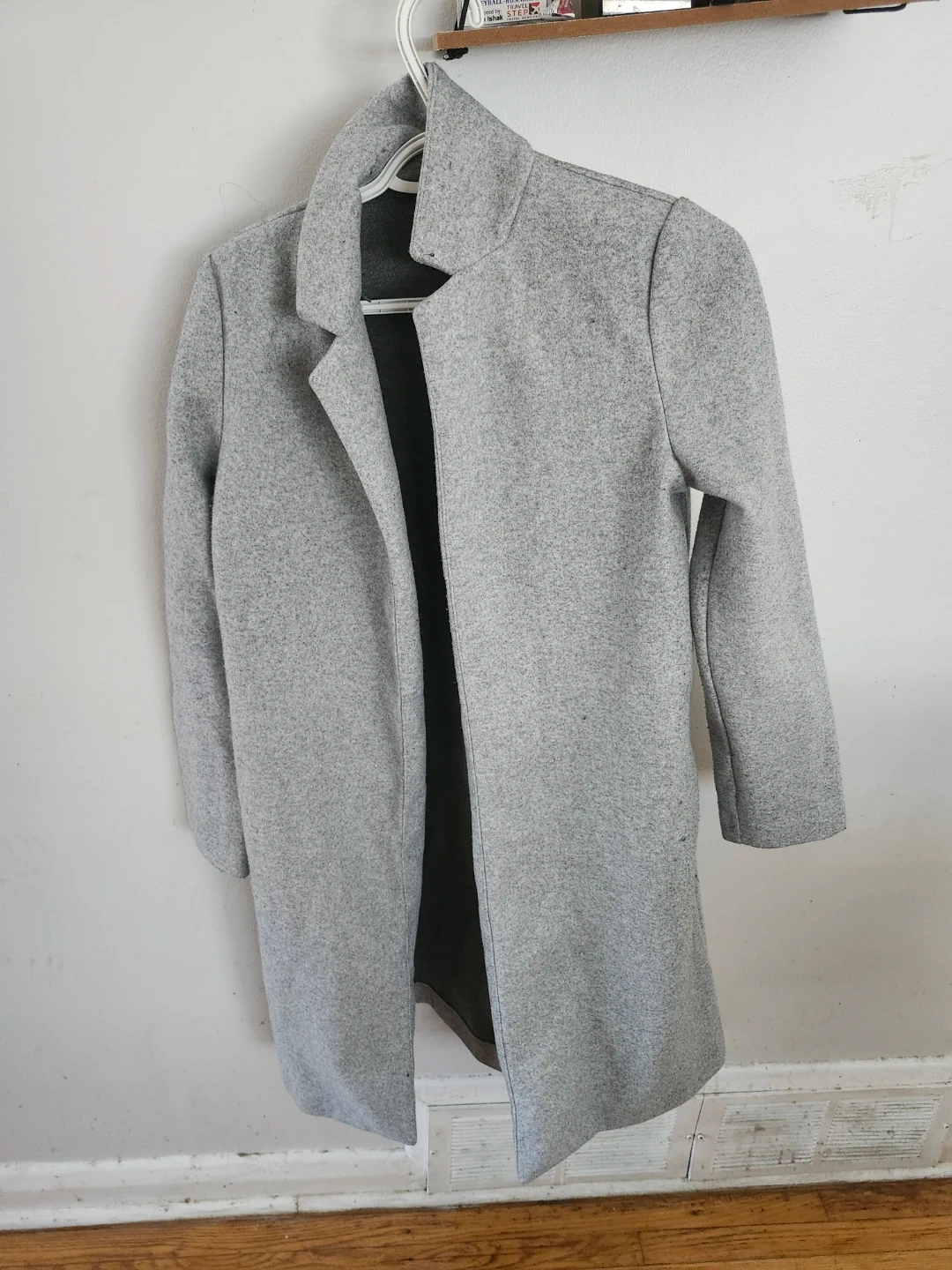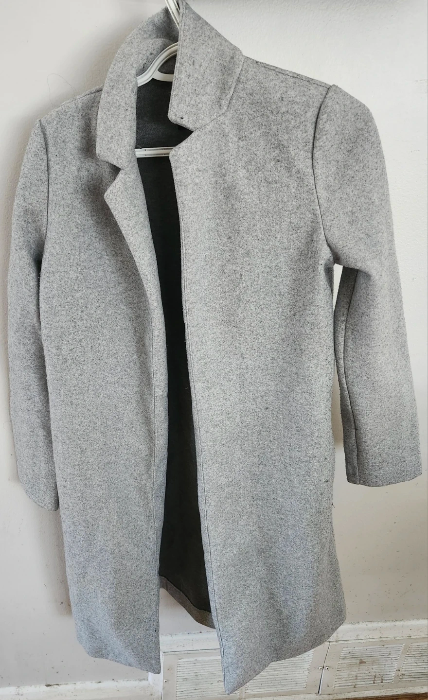 This is a grey wool-blend coat. It's a medium weight, perfect for transitional weather. The coat features a collared neckline and two front pockets.