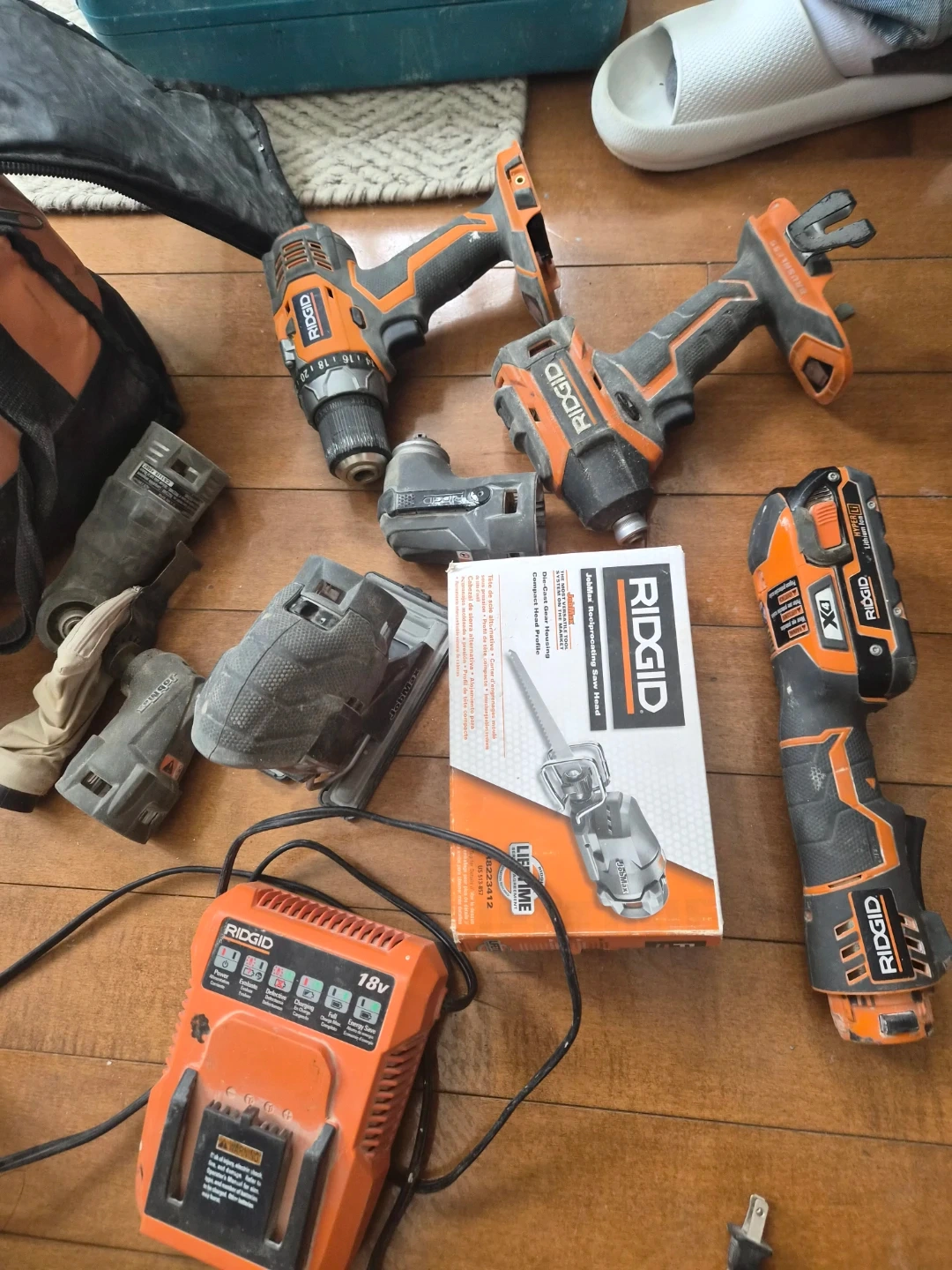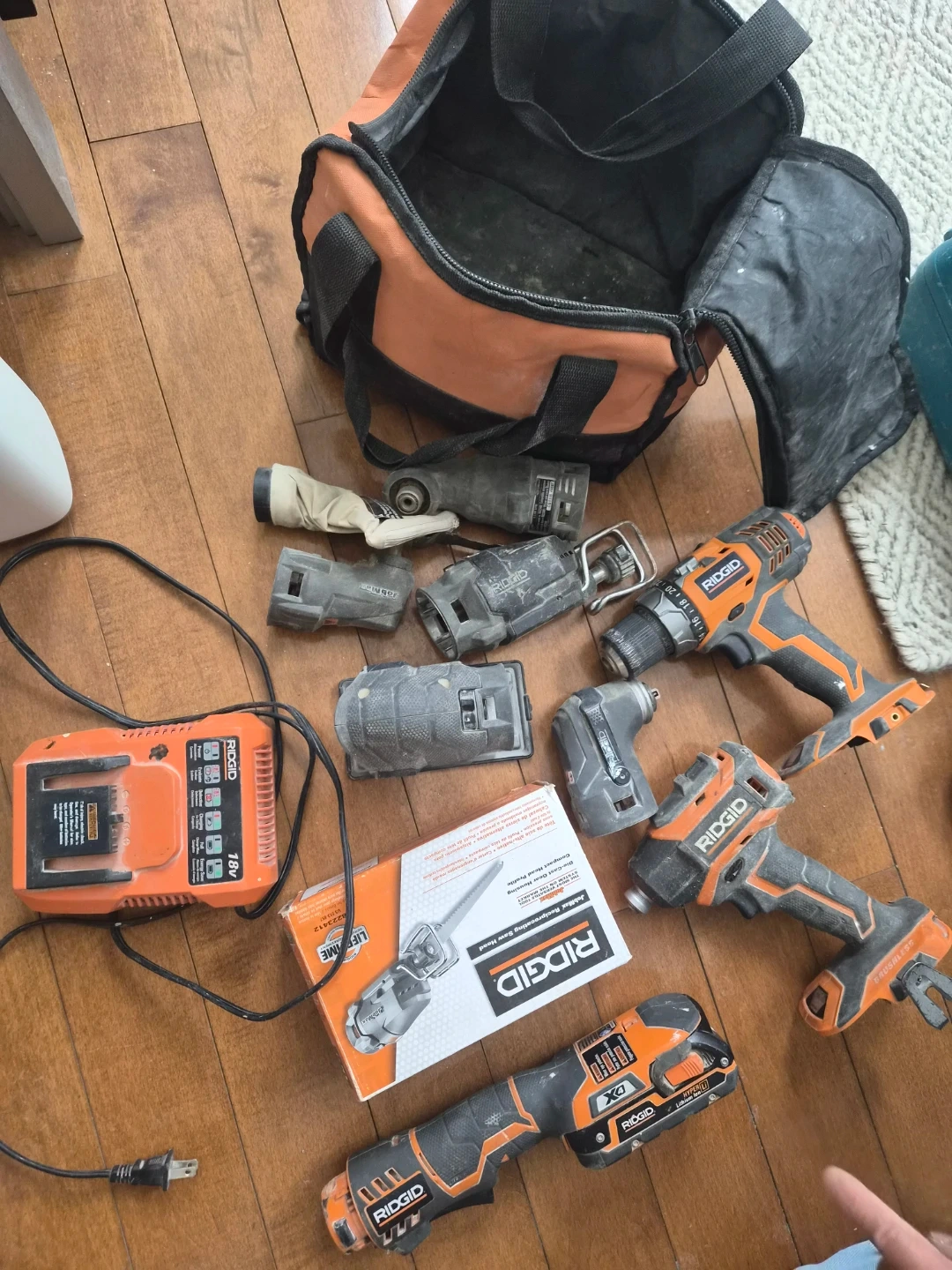 This RIDGID 18V cordless power tool set includes a drill, impact driver, reciprocating saw, and charger. It also comes with a durable carrying bag for transport. This collection is ideal for a variety of DIY and professional projects. It's made for efficient and reliable performance on the job site!