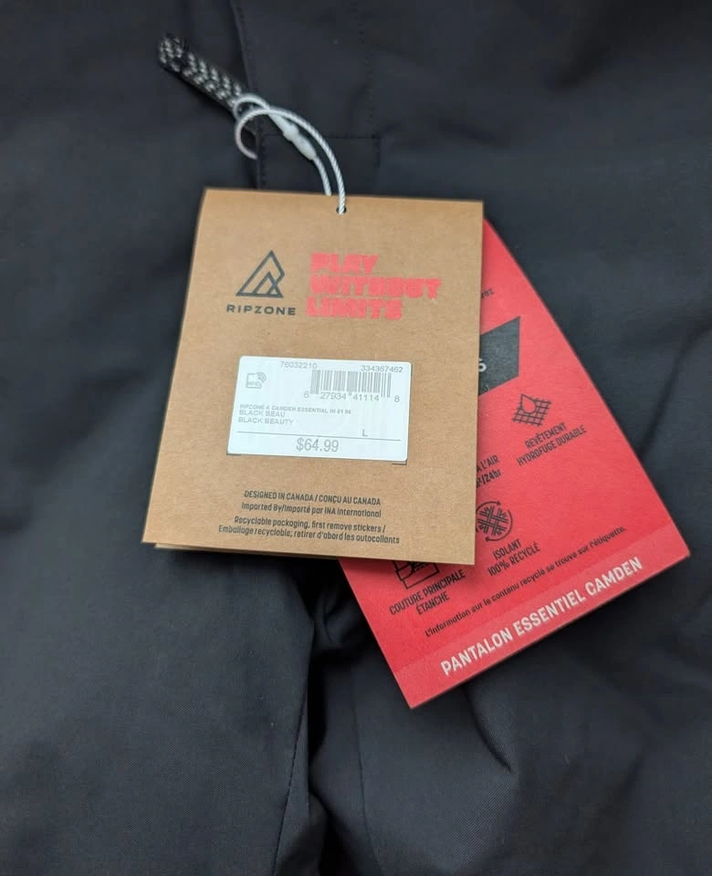 Brand new with tags. Ripzone "Camden" Boys/Junior Insulated Snow Pants. Perfect for school, skiing, or tobogganing. Size: Junior Boys Large. Color: Black. Pickup in Burlington (Appleby Line / Dundas area). Cash or e-transfer accepted.