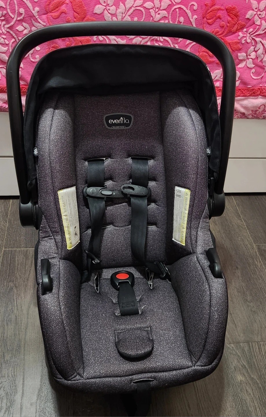 Evenflo infant car seat in a dark grey speckled fabric. It includes the car seat and the base. This car seat is designed for infants and comes with a 5-point harness for safety.