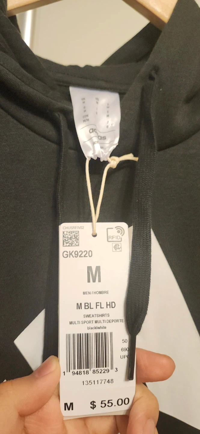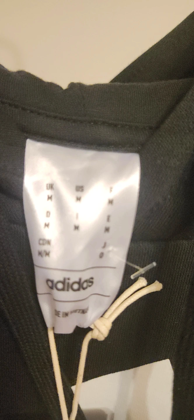 This is an Adidas men's black hoodie sweatshirt with a front kangaroo pocket. It's size medium. The material is a blend for comfort.