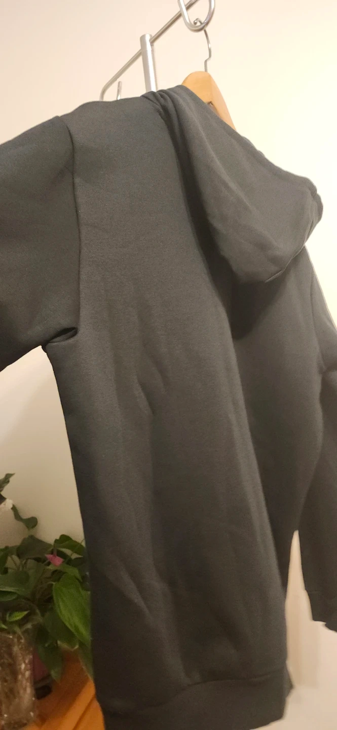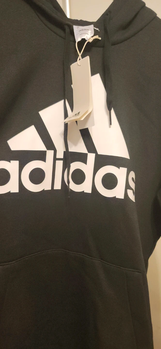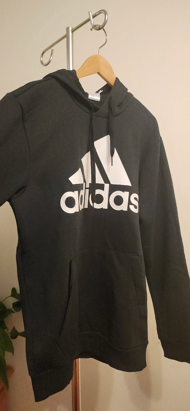This is an Adidas men's black hoodie sweatshirt with a front kangaroo pocket. It's size medium. The material is a blend for comfort.