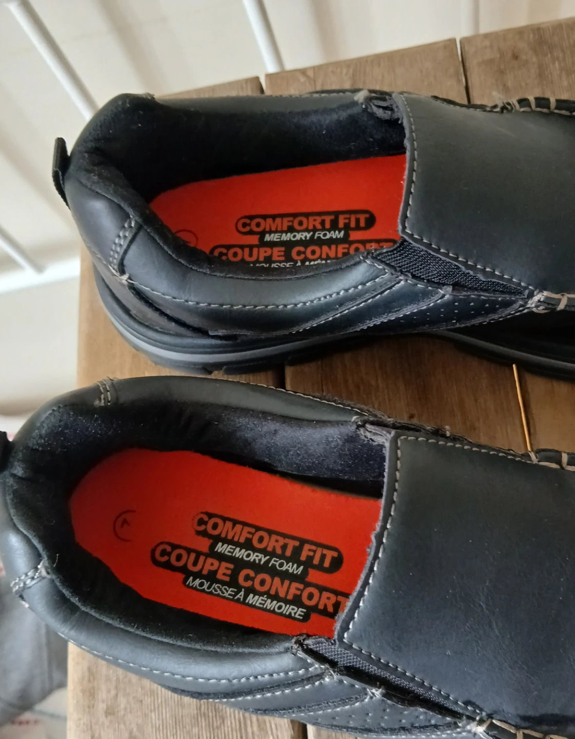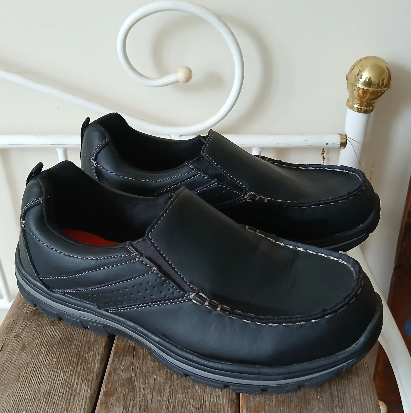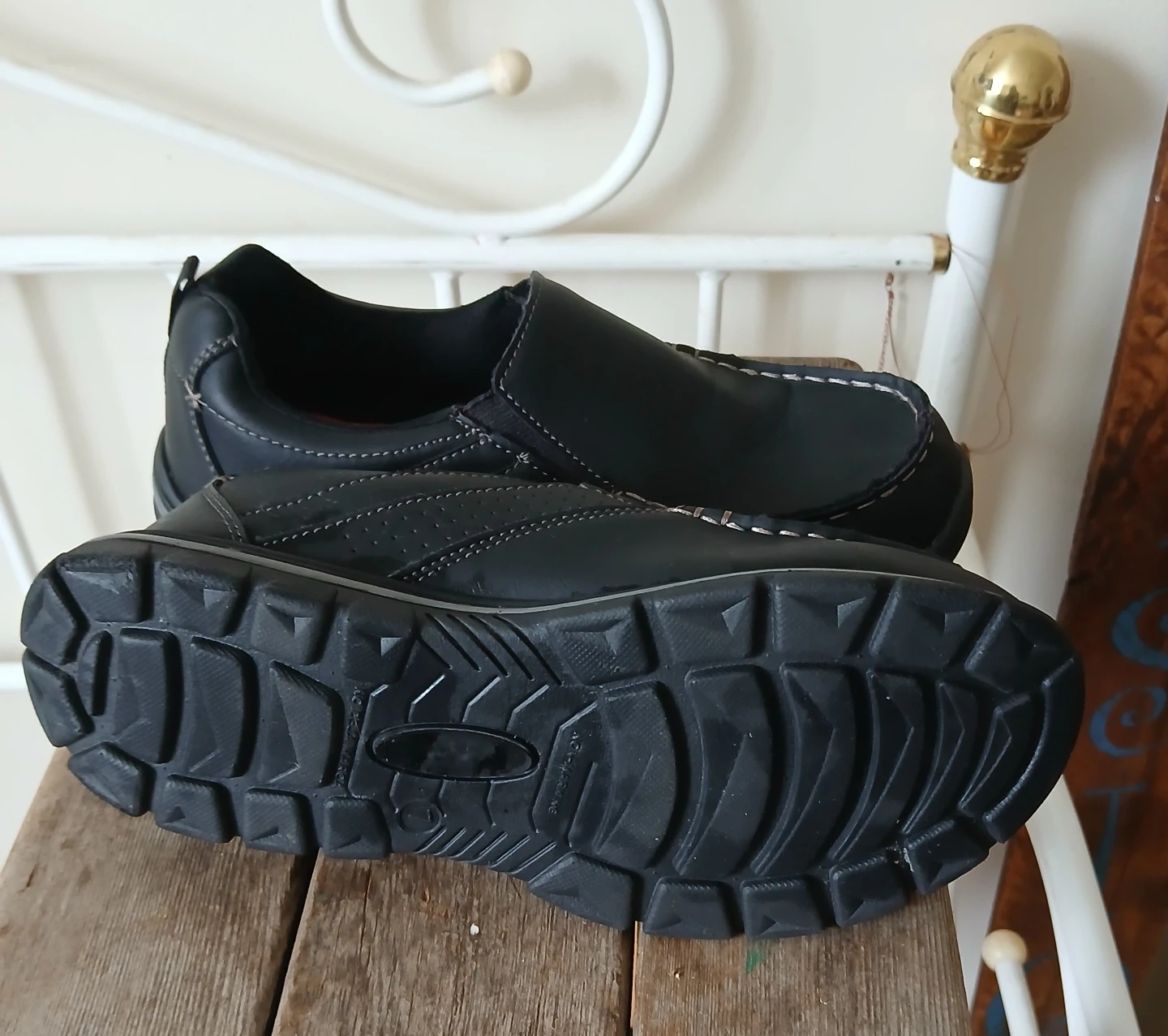 These black slip-on shoes feature a comfort fit with memory foam insoles. They have a durable sole for everyday wear. These shoes are good for casual outings.Womens size 7 wide fit