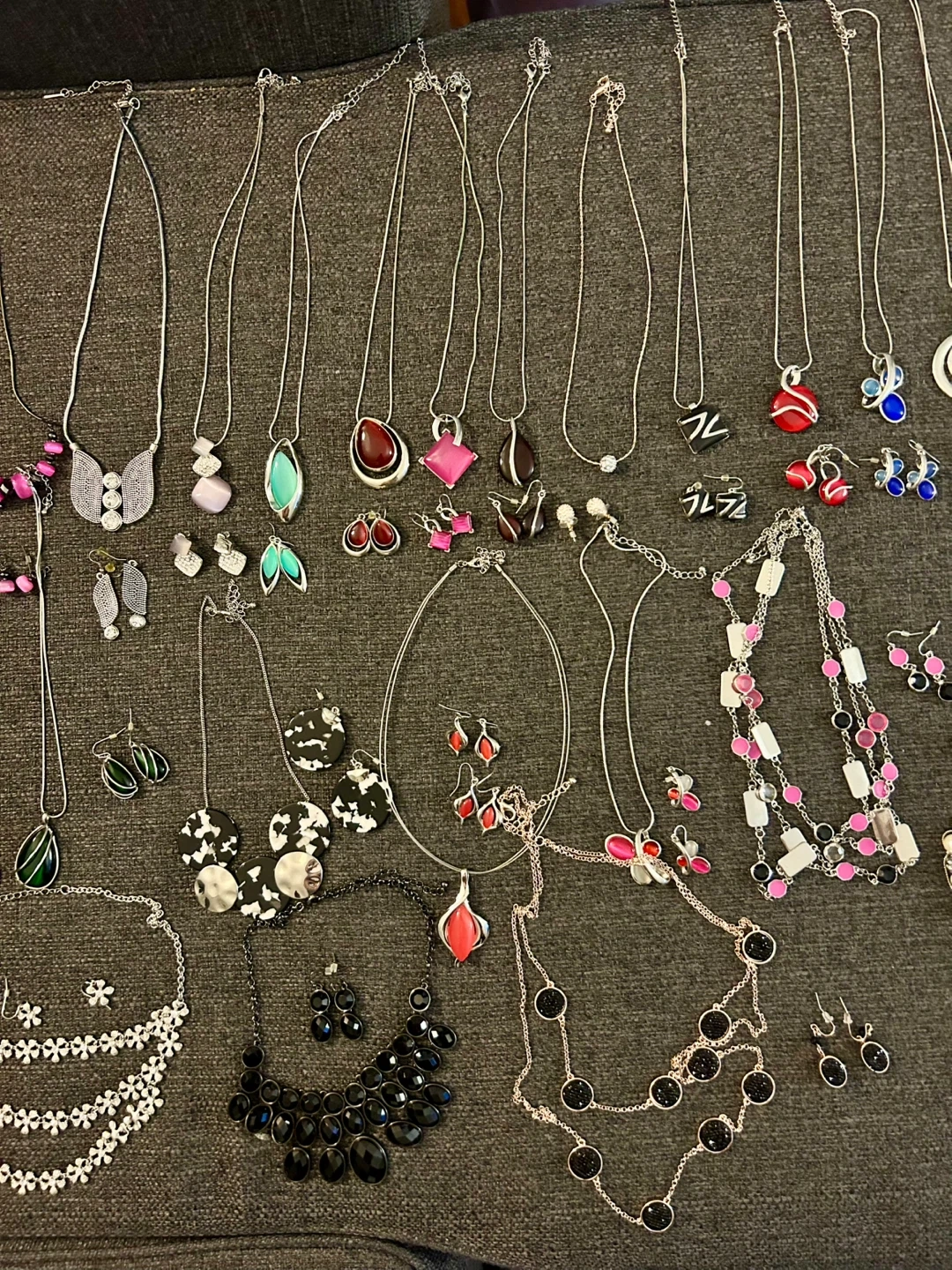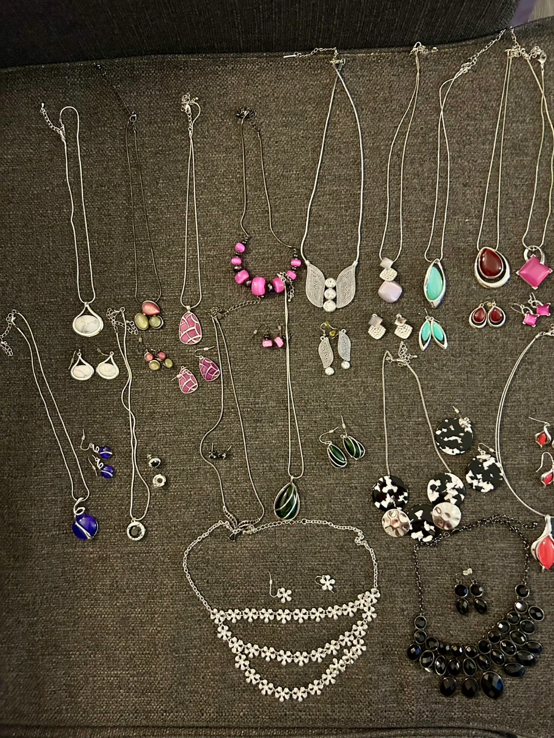 The lot includes statement necklaces, delicate chains, and matching earring sets.