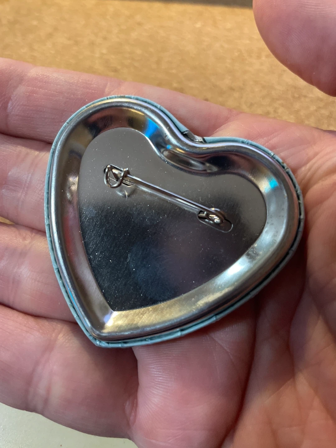 Funny heart-shaped pin with 'UR A DICK HEAD' text. It's a light blue colour with red lettering. Features a standard pin backing. Seems to have rusted a bit (noticeable on the front).