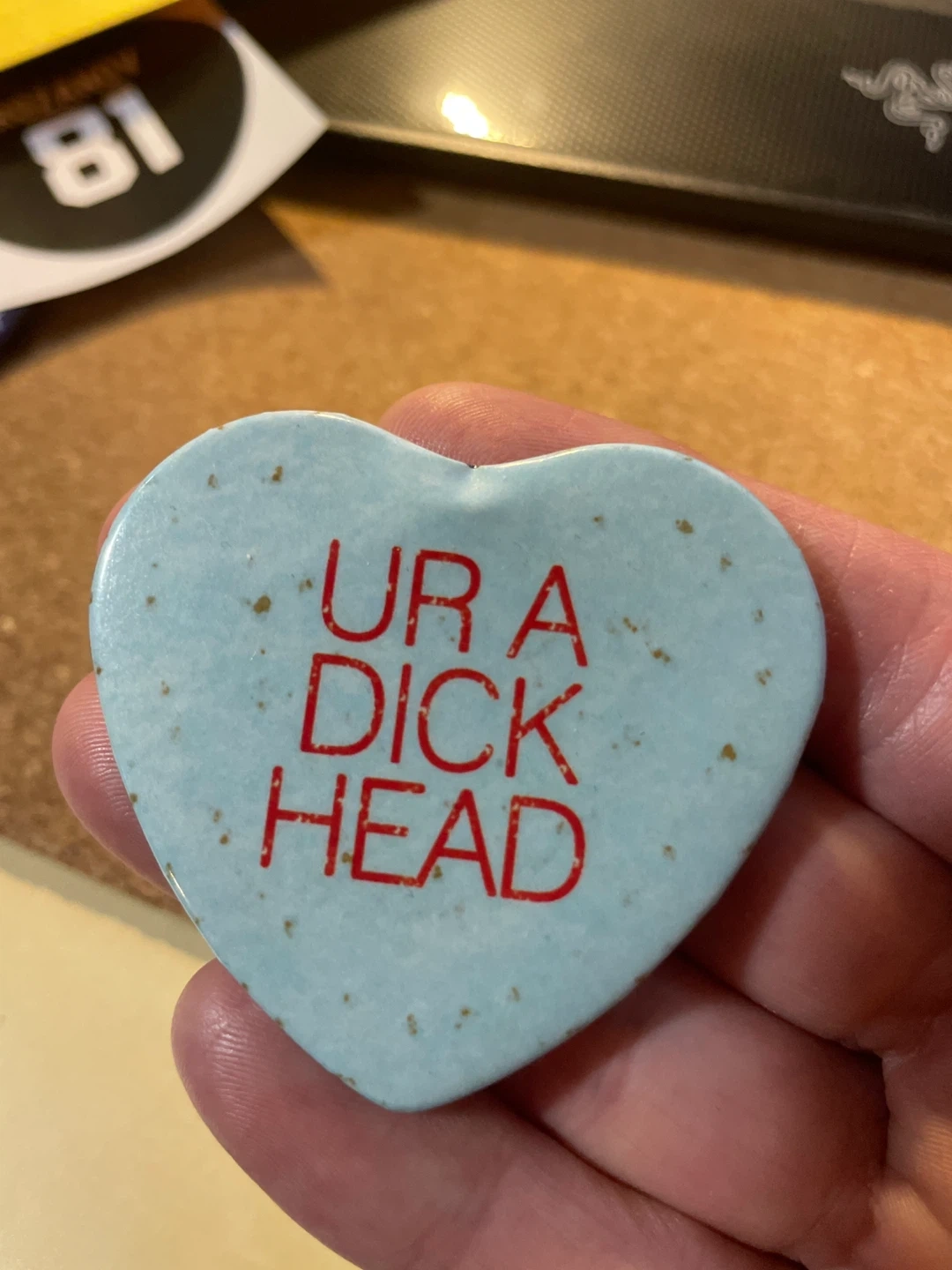Funny heart-shaped pin with 'UR A DICK HEAD' text. It's a light blue colour with red lettering. Features a standard pin backing. Seems to have rusted a bit (noticeable on the front).