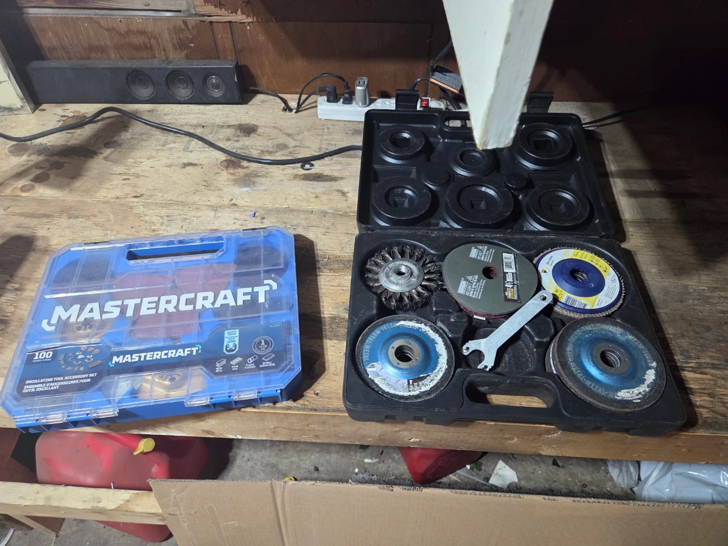 This Mastercraft set includes 100 oscillating tool accessories. It contains a variety of blades and discs for different tasks. Includes a wrench for attachment. Also have case with grinding disc's would like 40 587-336-4516 pick up today