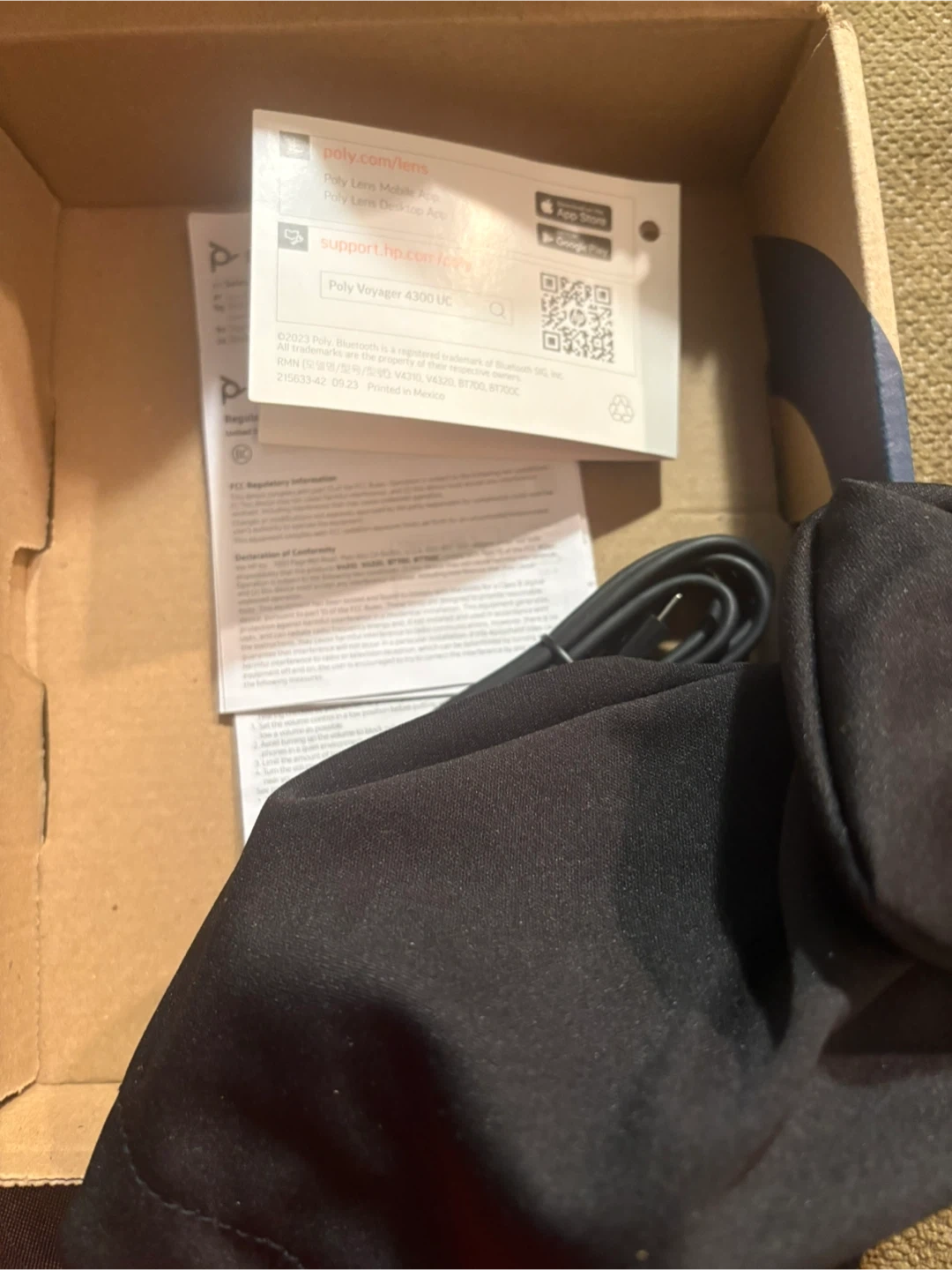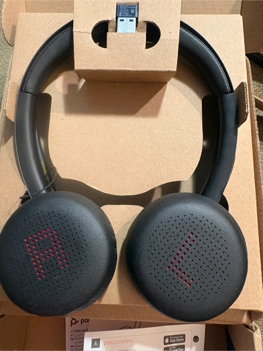 Poly Voyager 4320 UC wireless headset for calls and music. Includes a USB-A dongle and charging cable. Comfortable over-the-ear design.