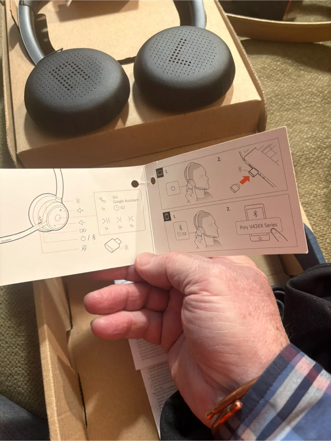 Poly Voyager 4320 UC wireless headset for calls and music. Includes a USB-A dongle and charging cable. Comfortable over-the-ear design.