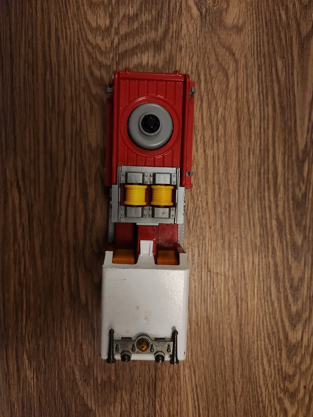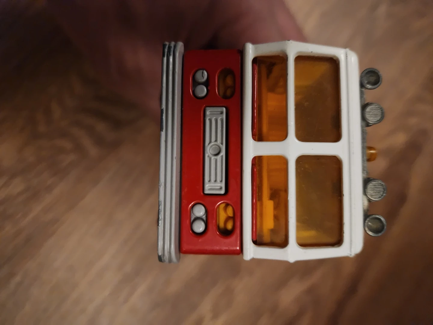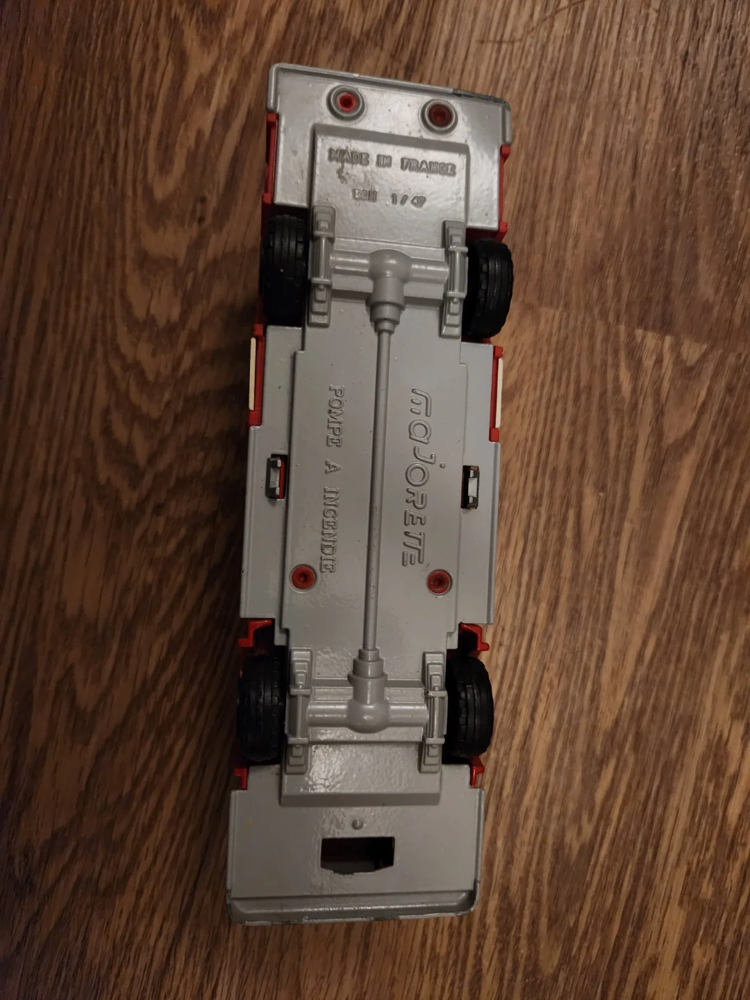 This is a vintage Majorette fire truck toy. It's made in France and features a red and white design. The truck has yellow-tinted windows and 'SOS' decals. Pick up Mavis and Dundas