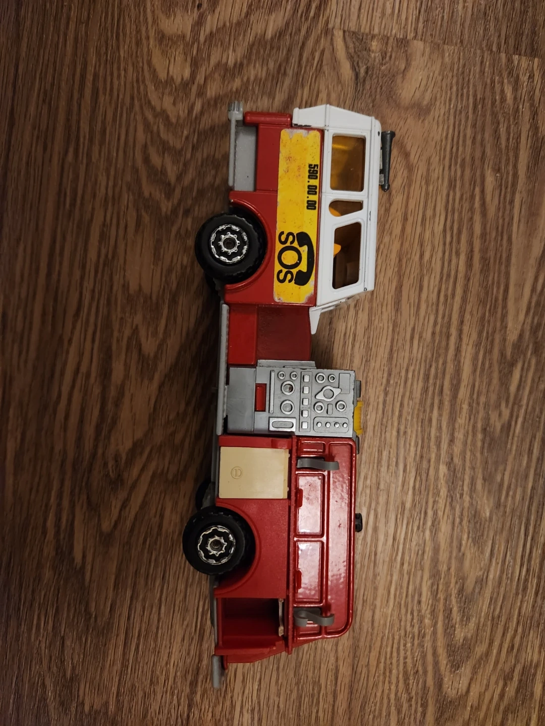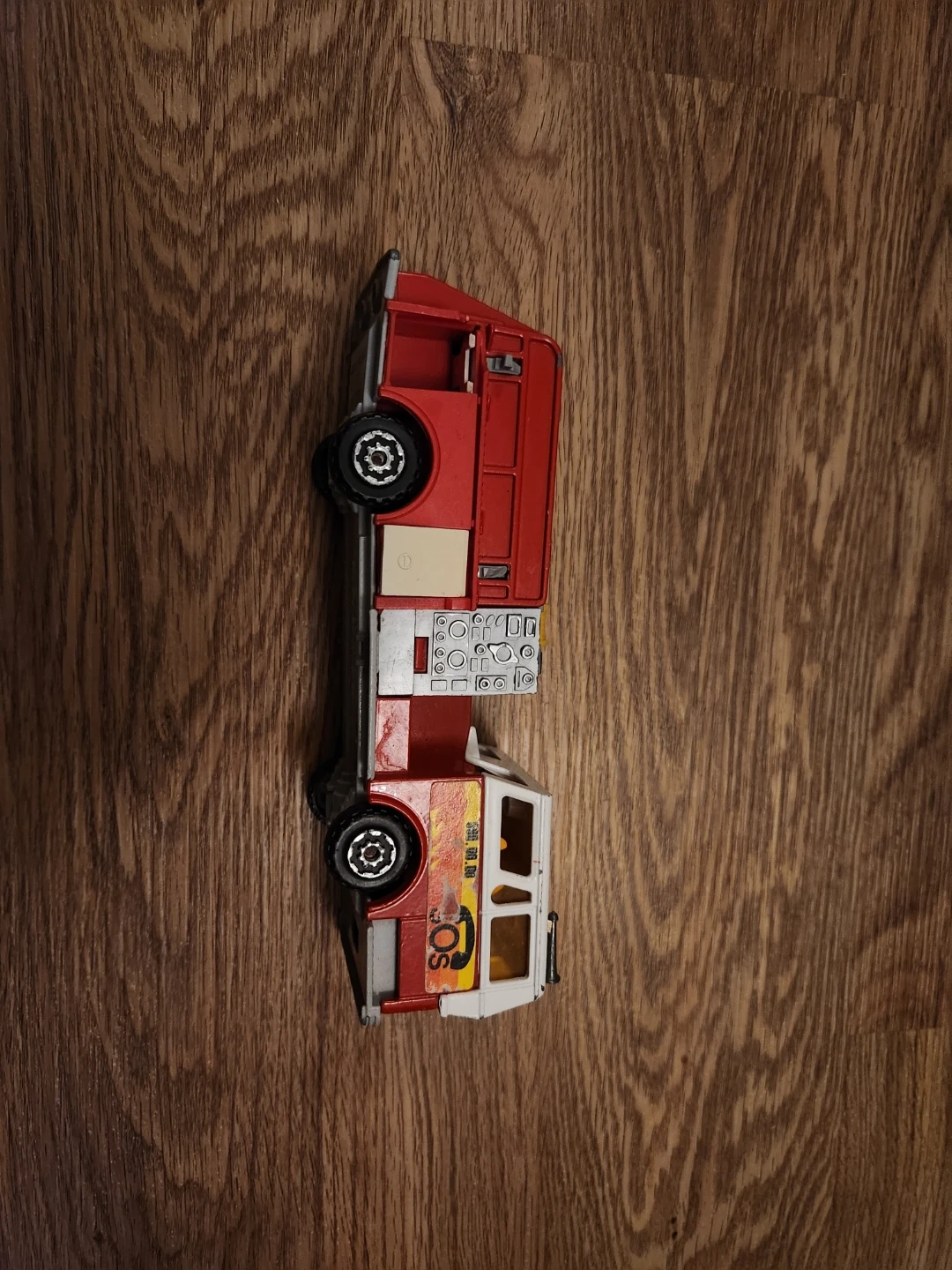 This is a vintage Majorette fire truck toy. It's made in France and features a red and white design. The truck has yellow-tinted windows and 'SOS' decals. Pick up Mavis and Dundas