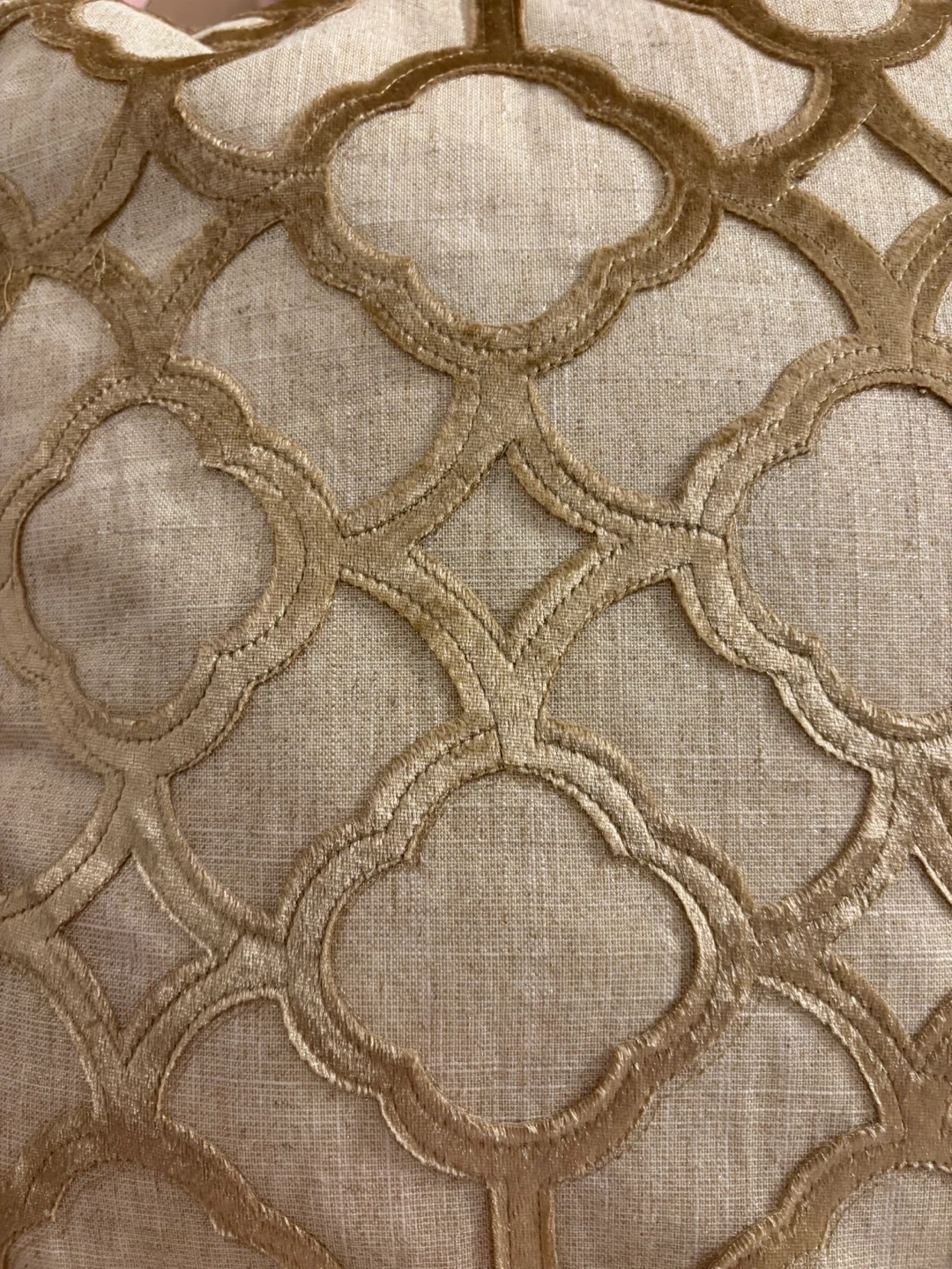 These decorative throw pillows feature an elegant geometric pattern in a subtle gold tone. They're made with a textured linen-look fabric and have a velvet overlay for a touch of luxury. A nice addition to any couch or armchair!