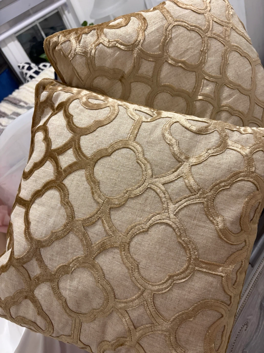 These decorative throw pillows feature an elegant geometric pattern in a subtle gold tone. They're made with a textured linen-look fabric and have a velvet overlay for a touch of luxury. A nice addition to any couch or armchair!