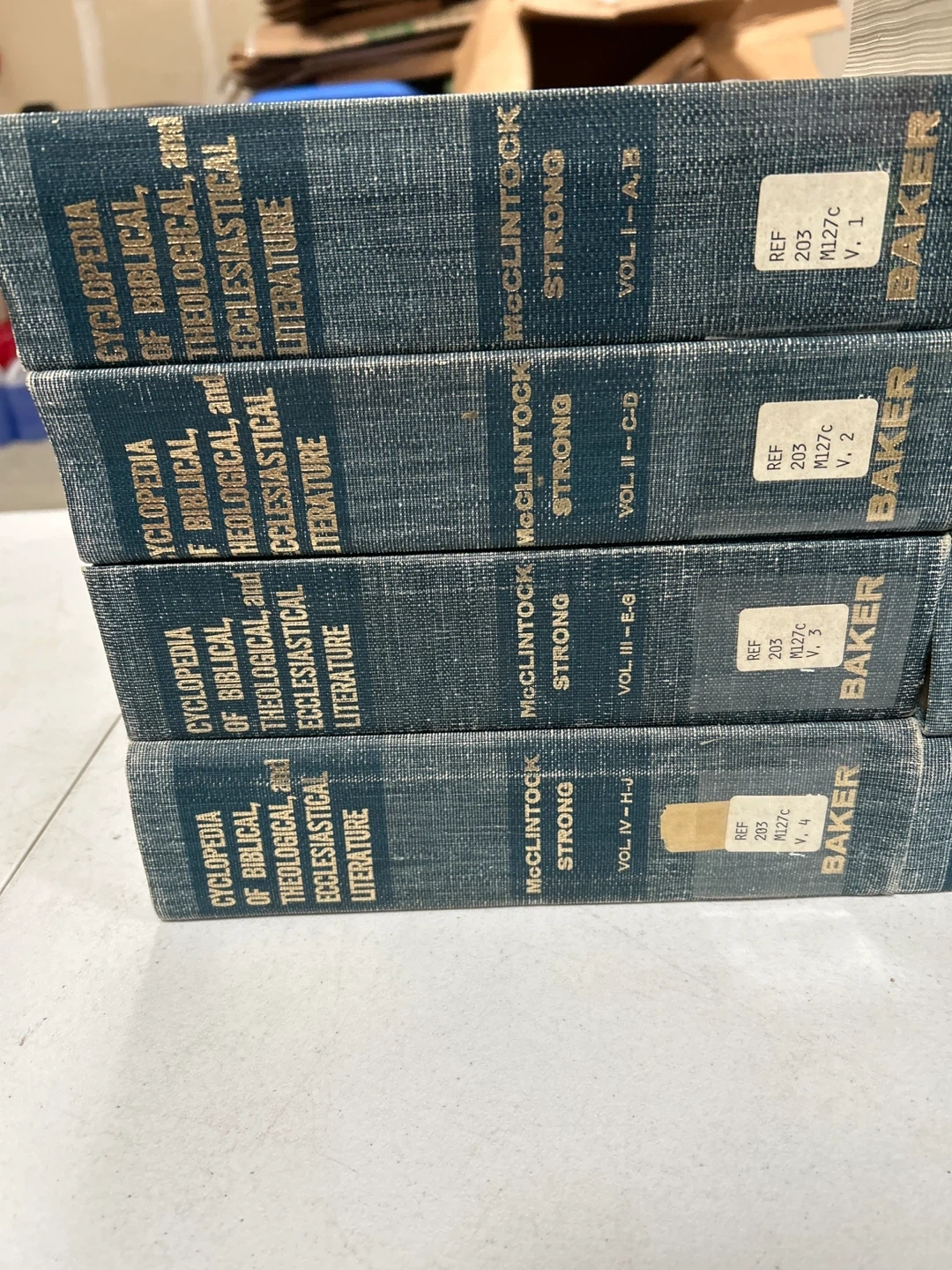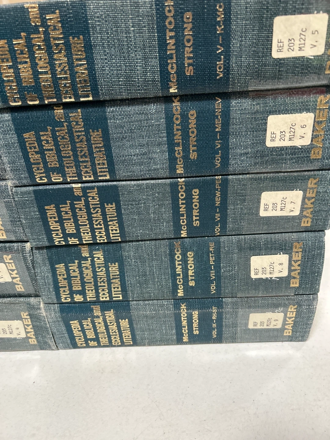 A 9-volume set of the Cyclopedia of Biblical, Theological, and Ecclesiastical Literature. Published by Baker. These are reference books for theological study. Volumes are V.1 A-B, V.2 C-D, V.3 E-G, V.4 H-J, V.5 K-Mc, V.6 Me-N, V.7 O-P, V.8 Q-S, and V.9 T-Z.