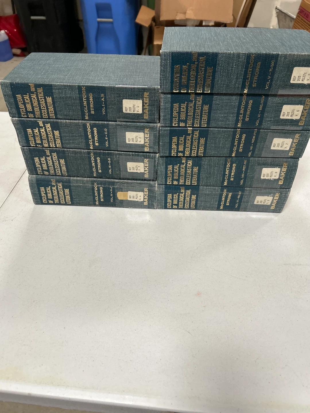 A 9-volume set of the Cyclopedia of Biblical, Theological, and Ecclesiastical Literature. Published by Baker. These are reference books for theological study. Volumes are V.1 A-B, V.2 C-D, V.3 E-G, V.4 H-J, V.5 K-Mc, V.6 Me-N, V.7 O-P, V.8 Q-S, and V.9 T-Z.