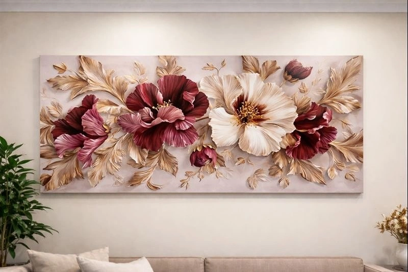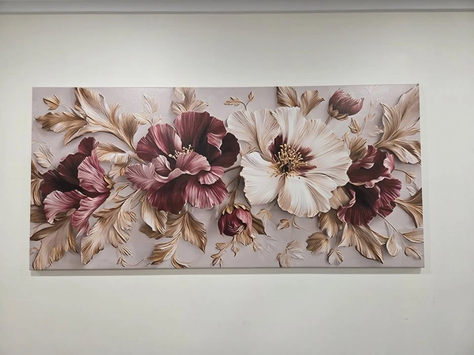 Instantly elevate your space with soft elegance and modern luxury. This large floral canvas wall art features rich burgundy, blush, and ivory flowers with subtle gold-toned leaves, creating a warm and sophisticated focal point. Designed to look high-end and timeless, this piece blends beautifully with modern, neutral, and elegant interiors.